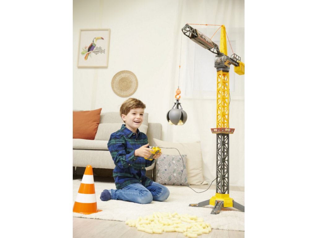 Jeřáb na kabelové ovládání (vpravo, vlevo, nahoru, dolů). Otáčí se o 360 stupňů, demoliční koule a doplňky. Barva černá/žlutá. Výška jeřábu je 110 cm.