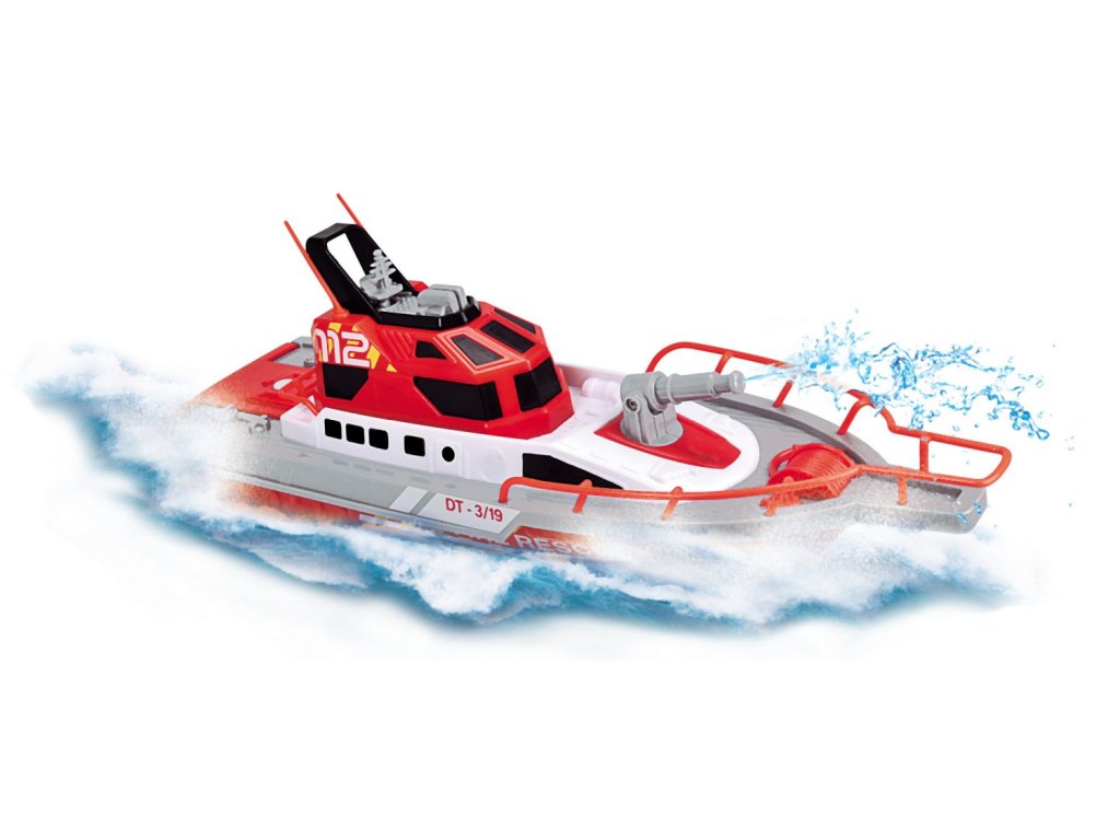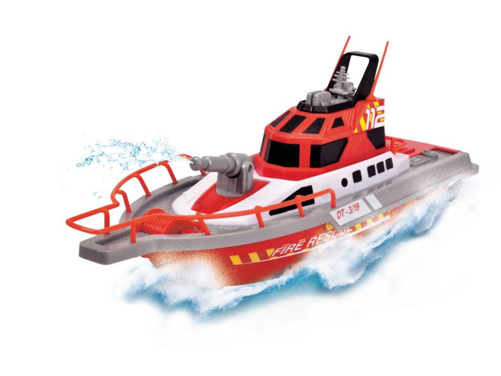 Záchranářská loď na dálkové ovládání, 3 kanály, frekvence 2,4 GHz, funkce turbo, funkční vodní stříkací dělo, rychlost až 3 km/h, součástí nabíjecí kabel USB, voděodolný spínač. Délka 38 cm.