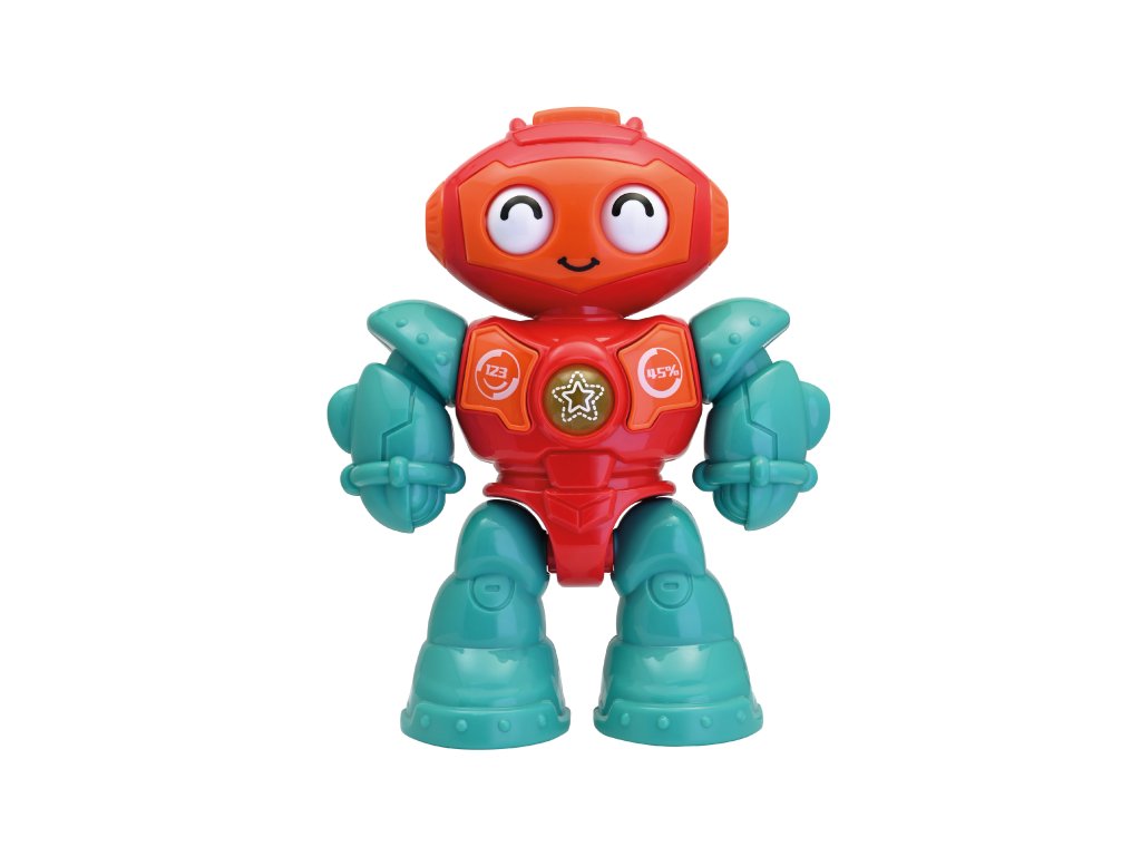 Volná kolečka na zadní straně nohou, lze ho posadit a jezdit. Automatické vypnutí při nečinnosti. 2 x AA, součástí.