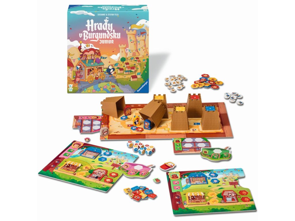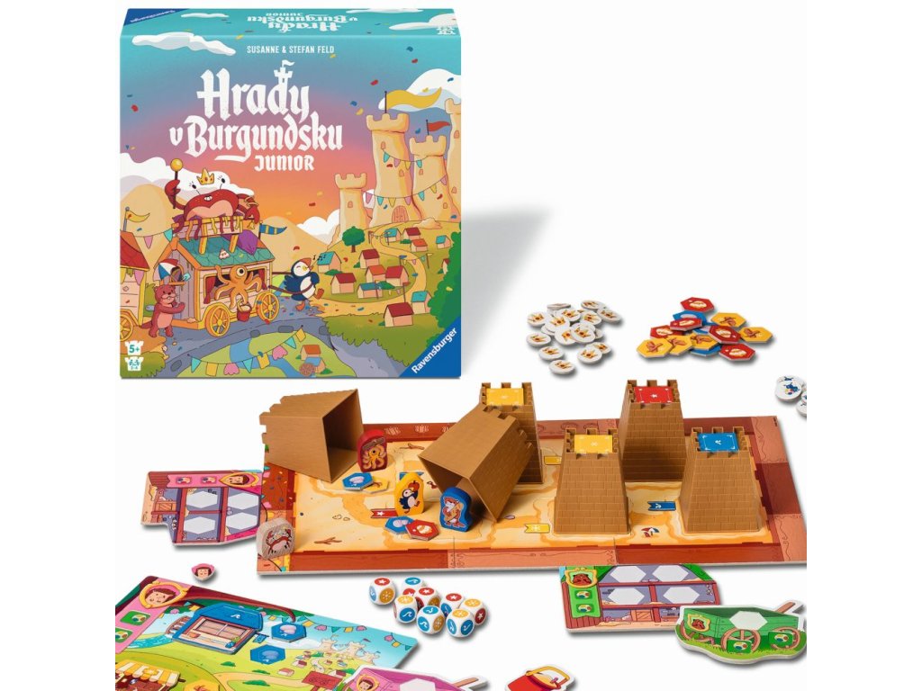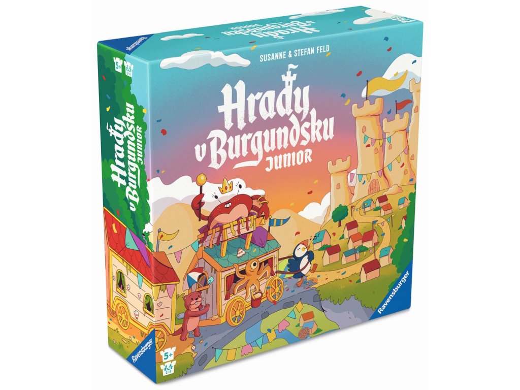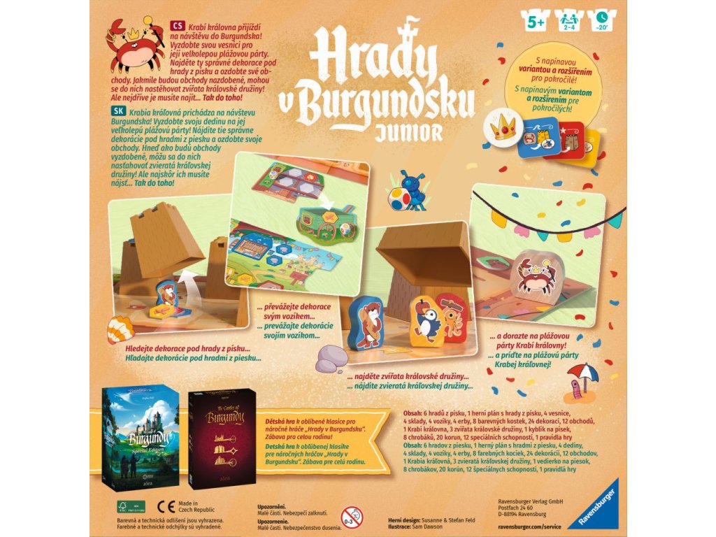 Krabí královna přijíždí do města a potřebuje pomoc s výzdobou své královské plážové party! V dětské verzi oblíbené hry Hrady v Burgundsku si děti od 5 let zahrají napínavou paměťovou hru, kde se pomocí kostek snaží najít správné dekorace, převézt je do své vesnice a získat co nejvíce bodů. Když nasbírají dvě dekorace stejné barvy, mohou se pokusit najít i zvířecího pomocníka královny – ale jen pokud si zapamatují, pod kterým pískovým hradem se skrývá. Hra rozvíjí paměť, taktiku a přináší spoustu zábavy v krásně ilustrovaném světě Burgundska – ať už hrajete ve dvou, nebo ve čtyřech.