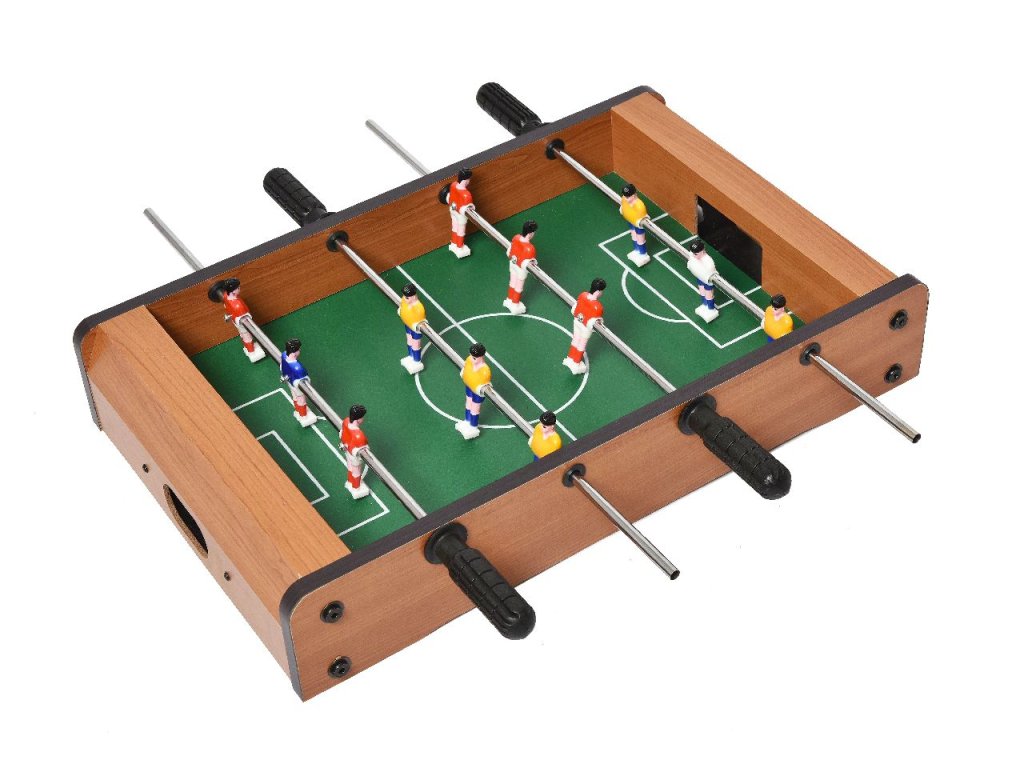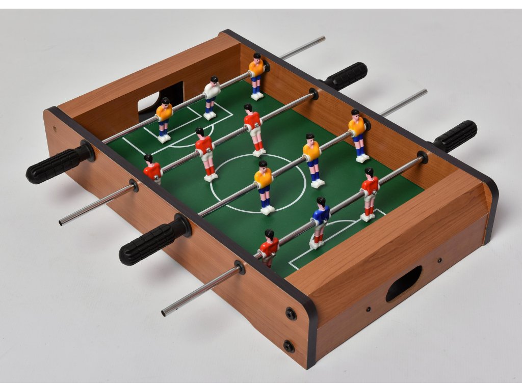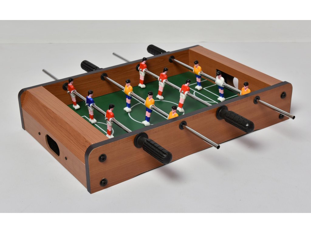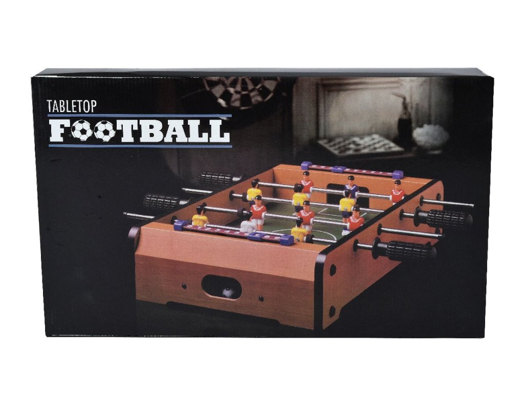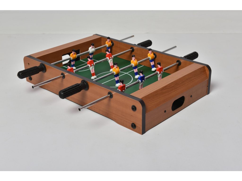 Tento menší stolní fotbálek je určen pro zábavu a trénuje motoriku a koordinaci rukou a očí! Vybavený 6 figurkami na každé straně určitě hráče nadchne skvělými souboji na stole! Hračka je vyrobena z barevného a lakovaného dřeva. Fotbálek je vybaven počítadly gólů a je dodáván včetně 2 míčků.