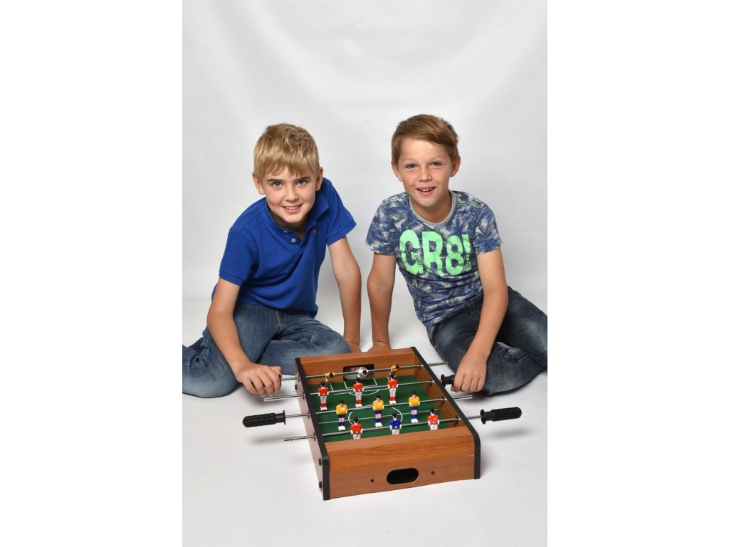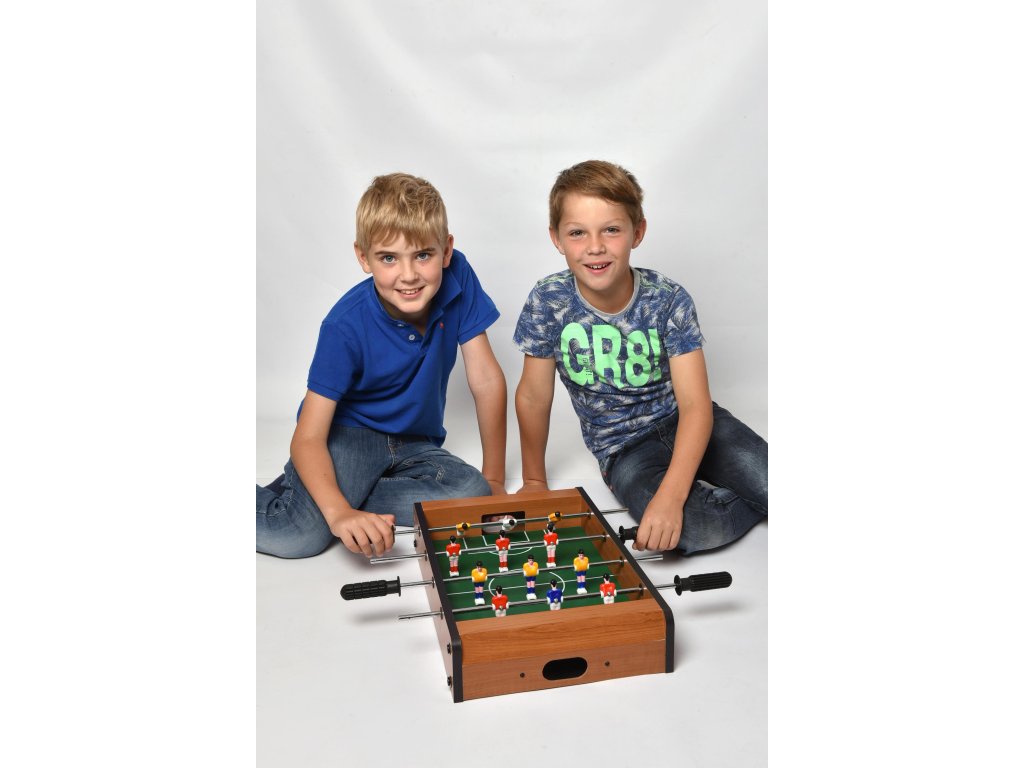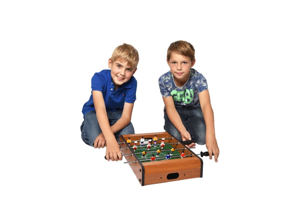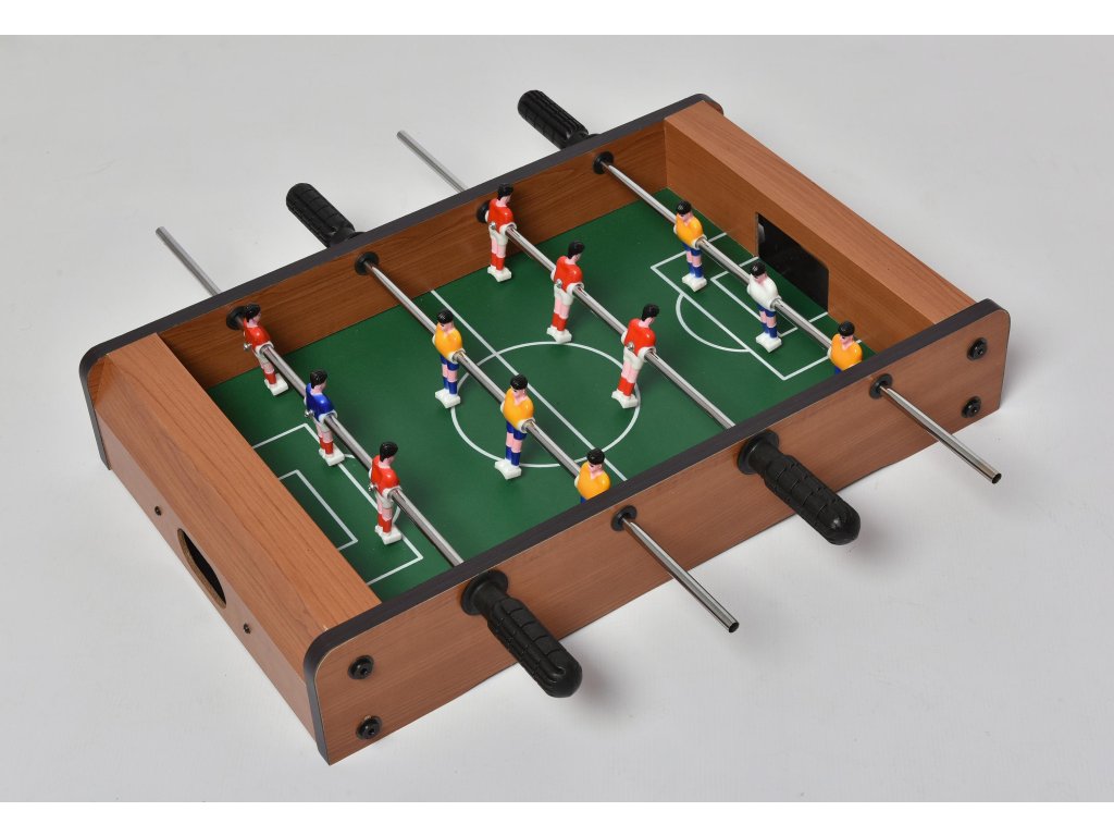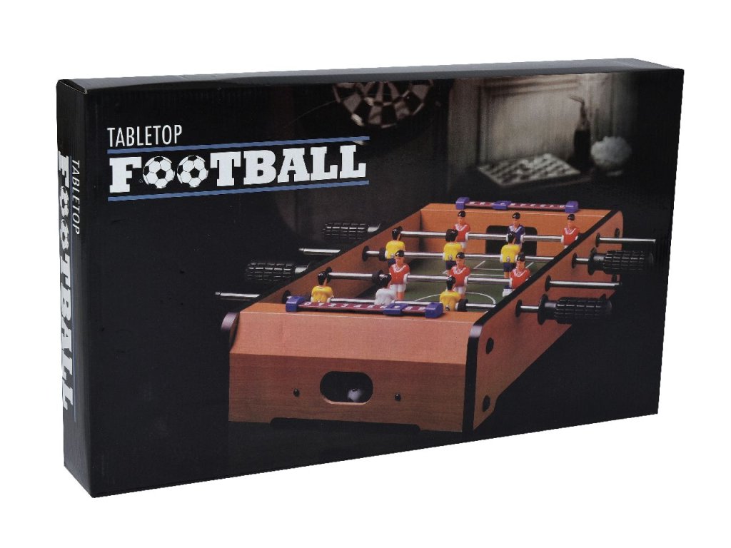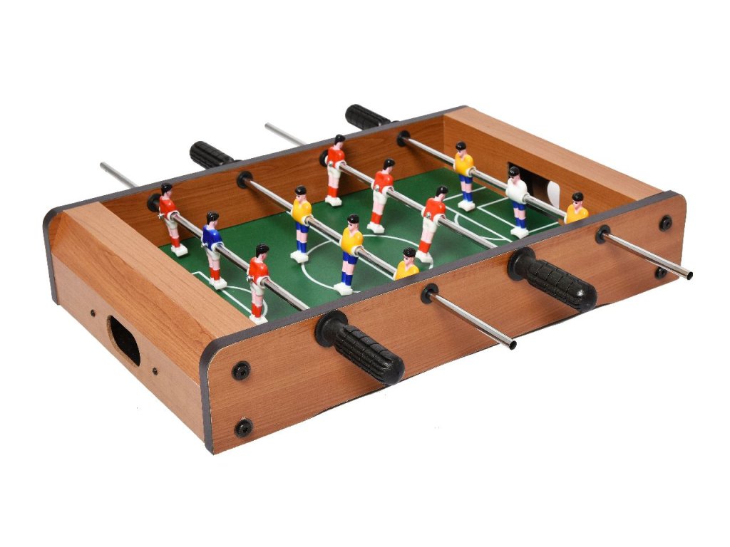 Tento menší stolní fotbálek je určen pro zábavu a trénuje motoriku a koordinaci rukou a očí! Vybavený 6 figurkami na každé straně určitě hráče nadchne skvělými souboji na stole! Hračka je vyrobena z barevného a lakovaného dřeva. Fotbálek je vybaven počítadly gólů a je dodáván včetně 2 míčků.