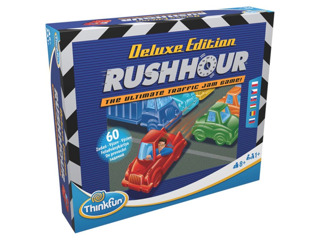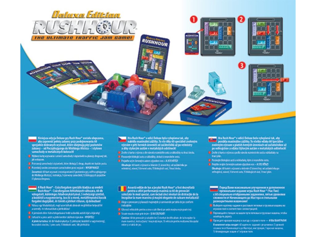 Hra Rush Hour v edici Deluxe byla vylepšena tak, aby nabídla maximální zážitky ze hry. To vše díky 60 speciálně zvoleným výzvám v pěti herních úrovních od začátečníků až po velmistry a díky stylovým autům v metalických odstínech! Posouvejte blokující auta a náklaďáky v pruzích nahoru a dolů, vpravo a vlevo, dokud neuvolníte cestu k úniku červenému autu. Vozidly lze pohybovat dopředu a dozadu, ale ne do stran. Obsahuje: 60 karet s výzvami a řešením (5 úrovní hry; od začátečníka po velmistra), návod, 1 červené auto, 15 blokujících aut, 1 hrací deska.