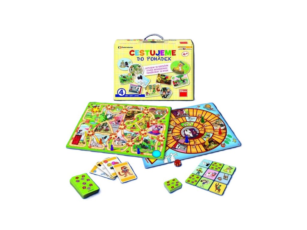 Hra Cestujeme do pohádek. Balení obsahuje 1 oboustranný herní plán, 1 hrací kostku, 6 figurek, 25 karet Černého Petra, 48 kartiček pexesa a 1 pravidla. Hra je určena pro 2 - 6 hráčů. Vhodné pro děti od 4 let.