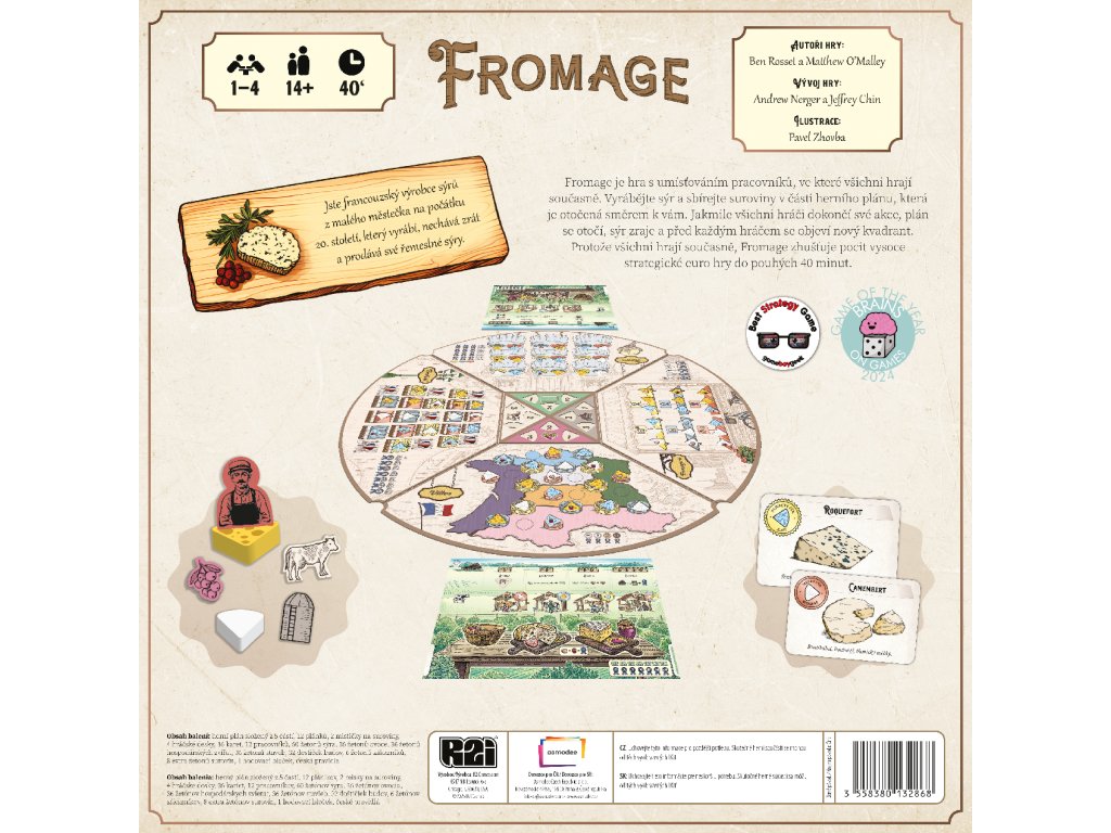 Fromage je hra s umísťováním pracovníků, ve které všichni hrají současně. Vyrábějte sýr a sbírejte suroviny v části herního plánu, která je otočená směrem k vám. Jakmile všichni hráči dokončí své akce, plán se otočí, sýr zraje a před každým hráčem se objeví nový kvadrant. Protože všichni hrají současně, Fromage zhušťuje pocit vysoce strategické euro hry do pouhých 40 minut.