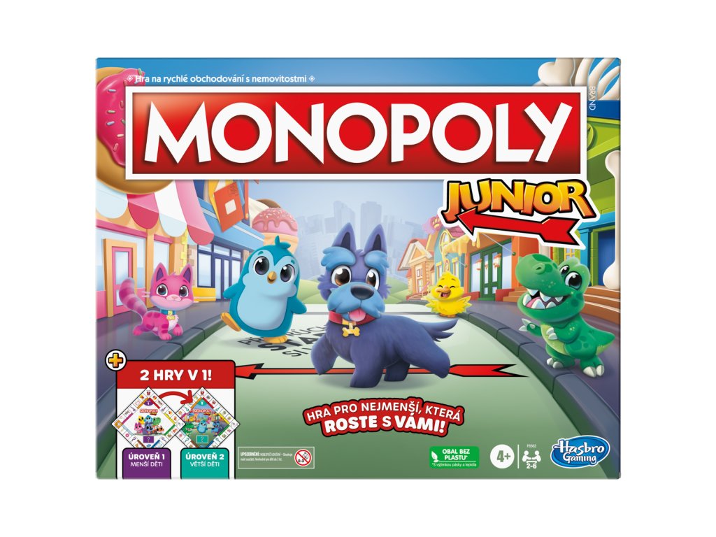Junior verze hry Monopoly od značky Hasbro. Tato nová verze obsahuje oboustrannou hrací desku, která umožňuje 2 způsoby hry. Díky jednoduché hratelnosti a lokalitám vhodným pro děti je tato hra skvělým vstupem do hry Monopoly. Je to hra, která roste s vašimi dětmi. Jedna strana je určena pro mladší děti (4+), a když ji otočíte, najdete pokročilejší hru pro starší předškoláky. Hra obsahuje sadu karet pro každou úroveň. Mladší děti mohou hrát s dolarovými bankovkami a starší děti mohou použít balíček pětidolarovek. Hra obsahuje žetony inspirované klasikou a představuje 2 nové žetony. Určeno pro 2-6 hráčů. Vhodné pro děti od 4 let. Rozměr balení: 33,3 x 26,7 x 4,1 cm.