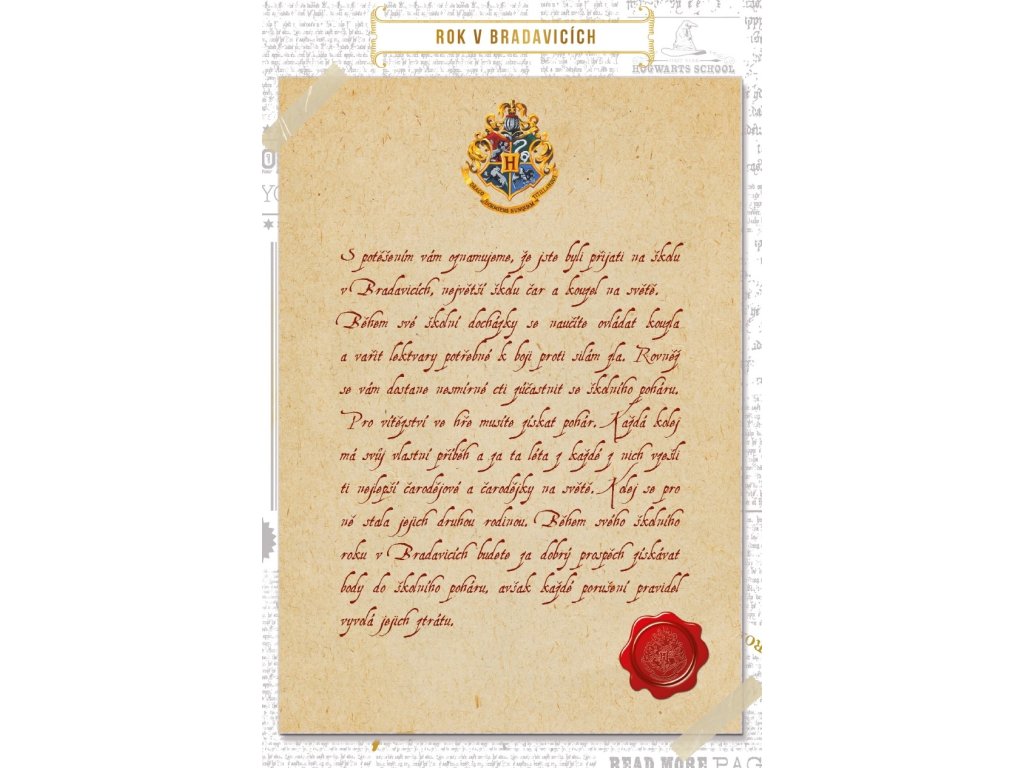 S potěšením vám oznamujeme, že jste byli přijati na školu čar a kouzel v Bradavicích. Během své školní docházky se naučíte ovládat kouzla a vařit lektvary potřebné k boji proti silám zla. Rovněž se vám dostane nesmírné cti zúčastnit se školního poháru.