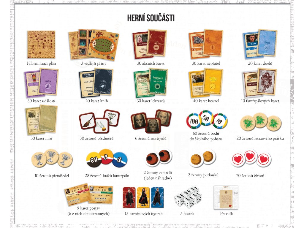 40 karet kouzel, 10 famfrpálových karet, 30 karet misí)