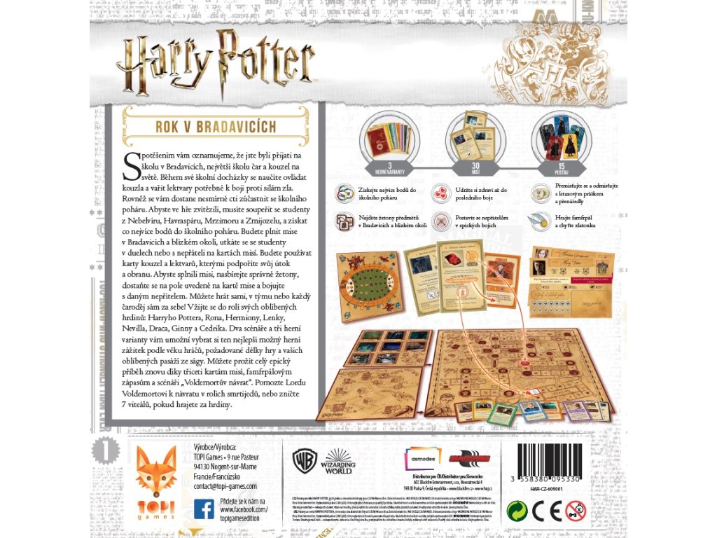 Můžete hrát sami, v týmu nebo každý čaroděj sám za sebe! Vžijte se do rolí svých oblíbených hrdinů: Harryho Pottera, Rona, Hermiony, Lenky, Nevilla, Draca, Ginny a Cedrika. Dva scénáře a tři herní varianty vám umožní vybrat si ten nejlepší možný herní zážitek podle věku hráčů, požadované délky hry a vašich oblíbených pasáží ze ságy. Celý epický příběh můžete prožít znovu díky třiceti kartám misí, famfrpálovým zápasům a scénáři „Voldemortův návrat“. Pomozte Lordu Voldemortovi k návratu v rolích smrtijedů, nebo zničte 7 viteálů, pokud hrajete za hrdiny.