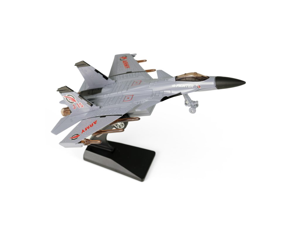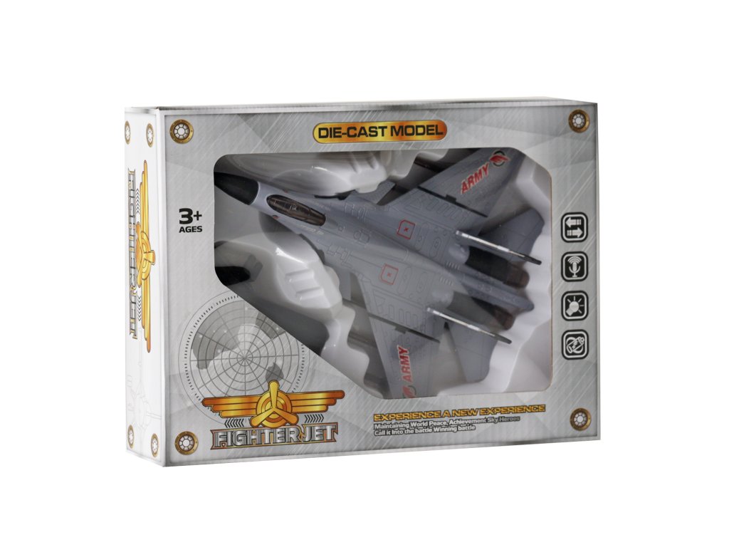 Vojenská stíhačka v hnědé barvě se zvukem a světlem. Vydává různé zvuky, bliká a svítí. Skvělé nejen pro všechny milovníky letadel. Jezdí na zpětný setrvačník. Velikost 23 cm. Letadlo vyžaduje použití 3 ks baterií typu AG13, které jsou součástí výrobku.