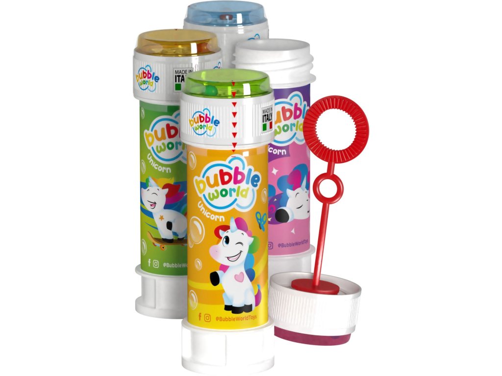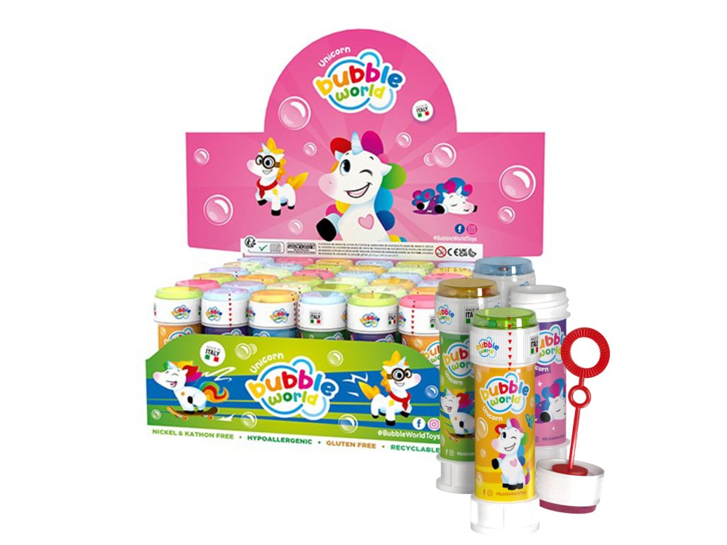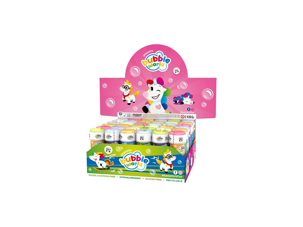 Bublifuk jednorožec o obsahu 60 ml. Součástí víčka je hra a foukátko. Lze zakoupit i jako celý display, kde je 36ks.
