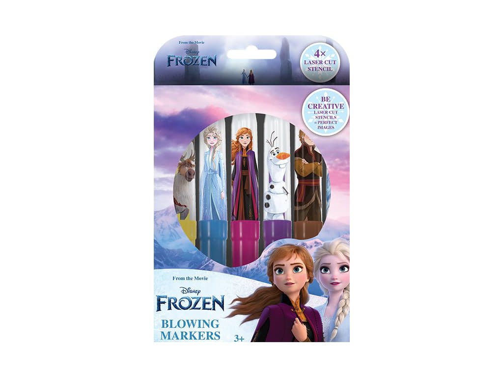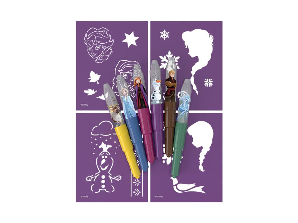 Balení obsahuje 6 barevných foukacích fixů s potiskem a 4 barevné papírové šablonky v oblíbených pohádkových motivech.