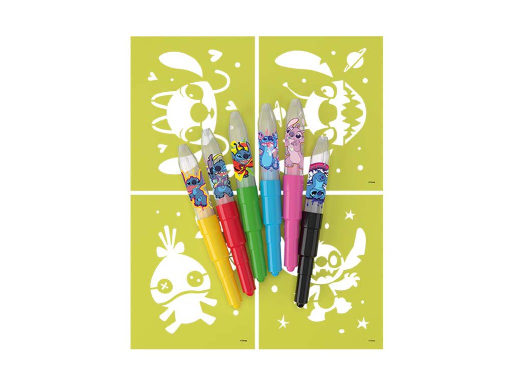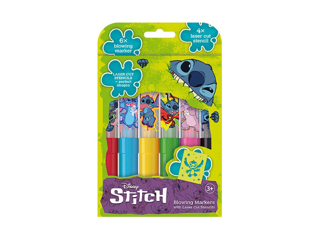 Balení obsahuje 6 barevných foukacích fixů s potiskem a 4 barevné papírové šablonky v oblíbených pohádkových motivech.