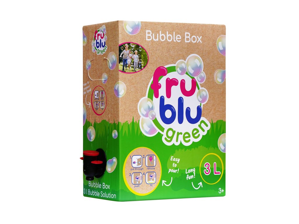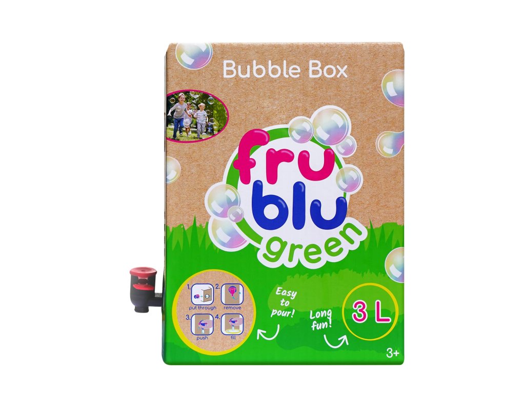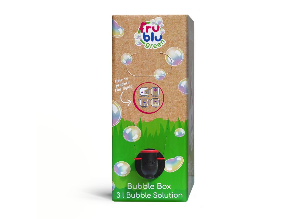 Bubble Box je inovativní přístup do světa duhových bublin, který spojuje skvělou zábavu s důrazem na ekologii a pohodlí při používání. Navíc je každý komponent Bubble Box recyklovatelný. Naše obaly jsou šetrné k životnímu prostředí a snadnost recyklace znamená, že se můžete hrdě zúčastnit ekologické bublinkové zábavy. Poznejte Bubble Box: - 3l tekutiny zaručí dlouhotrvající zábavu - díky velké zásobě tekutiny je zábava nekonečná!Snadné nalévání a prodloužená skladovatelnost tekutiny: jedinečný systém balení zajišťuje pohodlné použití a prodlouženou trvanlivost tekutiny. Použitý typ ventilu se nejčastěji používá v balení Bag-in-Box® díky své výjimečné kvalitě, tj. nízké míře úniku produktu (méně než 1 z 55 milionů balení). Pravděpodobnost rozlití tekutiny je mnohem nižší než u klasických lahví na tekutiny. To umožňuje prodloužit trvanlivost produktu. Rychlé a přesné nalévání kapaliny je nyní standardem! Vhodné také pro použití s ??dalšími produkty Fru Blu. Snadná recyklace a šetrnost k životnímu prostředí: záleží nám na budoucnosti, proto je každý komponent recyklovatelný. Použitý obal umožňuje igelitový sáček a kartonovou krabici od sebe oddělit a po použití vyhodit do příslušného kontejneru pro daný druh odpadu. Bag in box je řešení, které vám umožní efektivně snížit množství plastu použitého k balení tekutiny z bublin.Pohodlí - speciální otvory pro ruce umožňují snadné přenášení produktu. Bubble Box není jen zábava, je to inovativní revoluce ve světě bublin! Připojte se k n