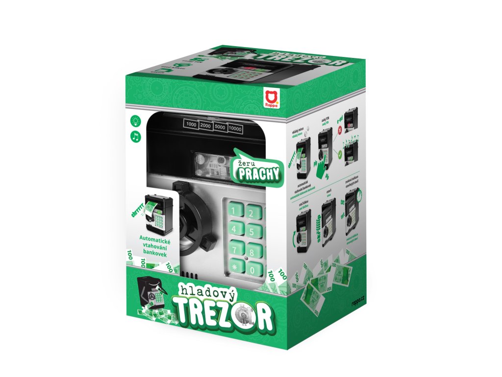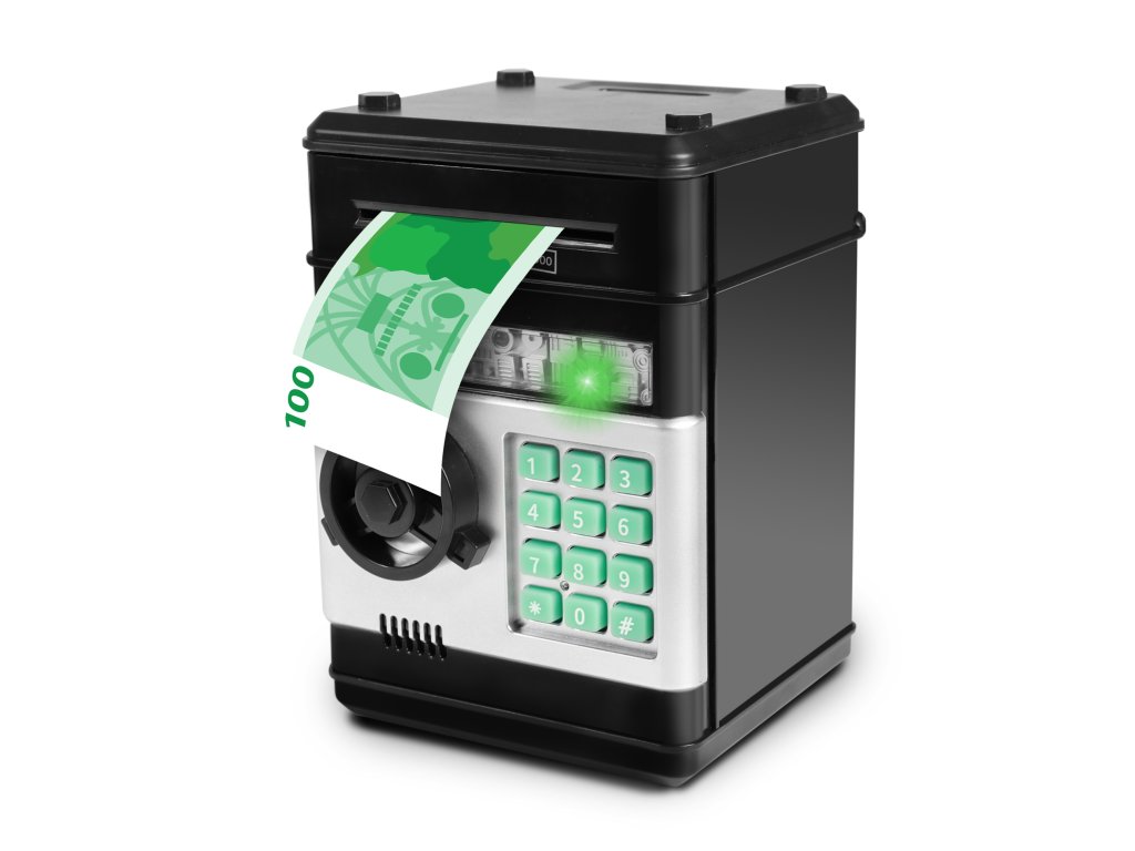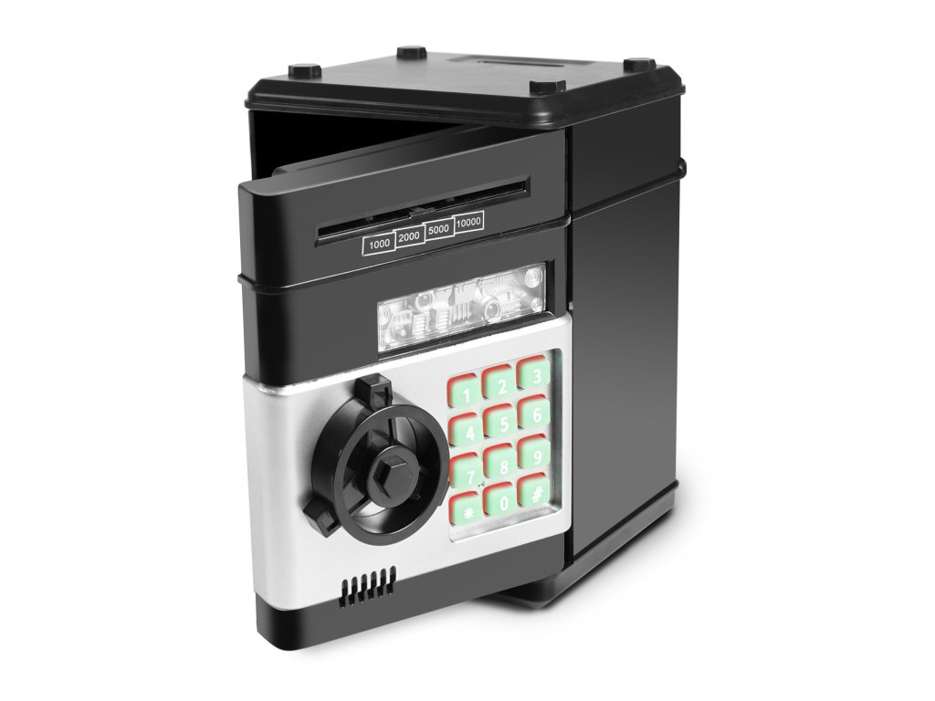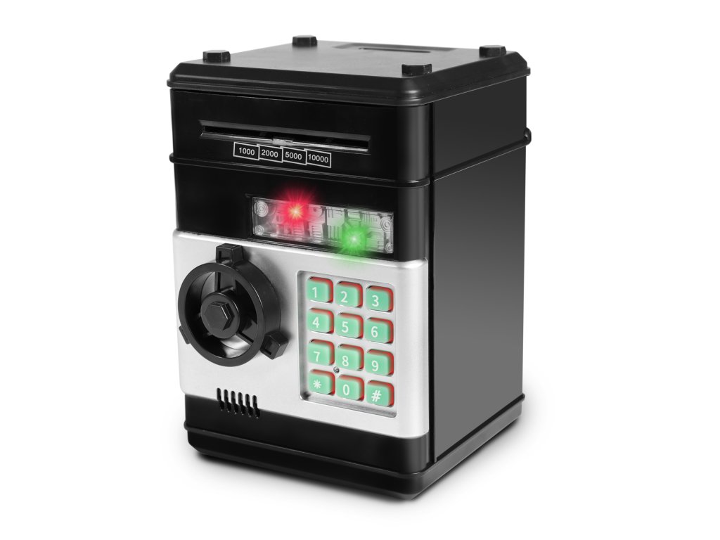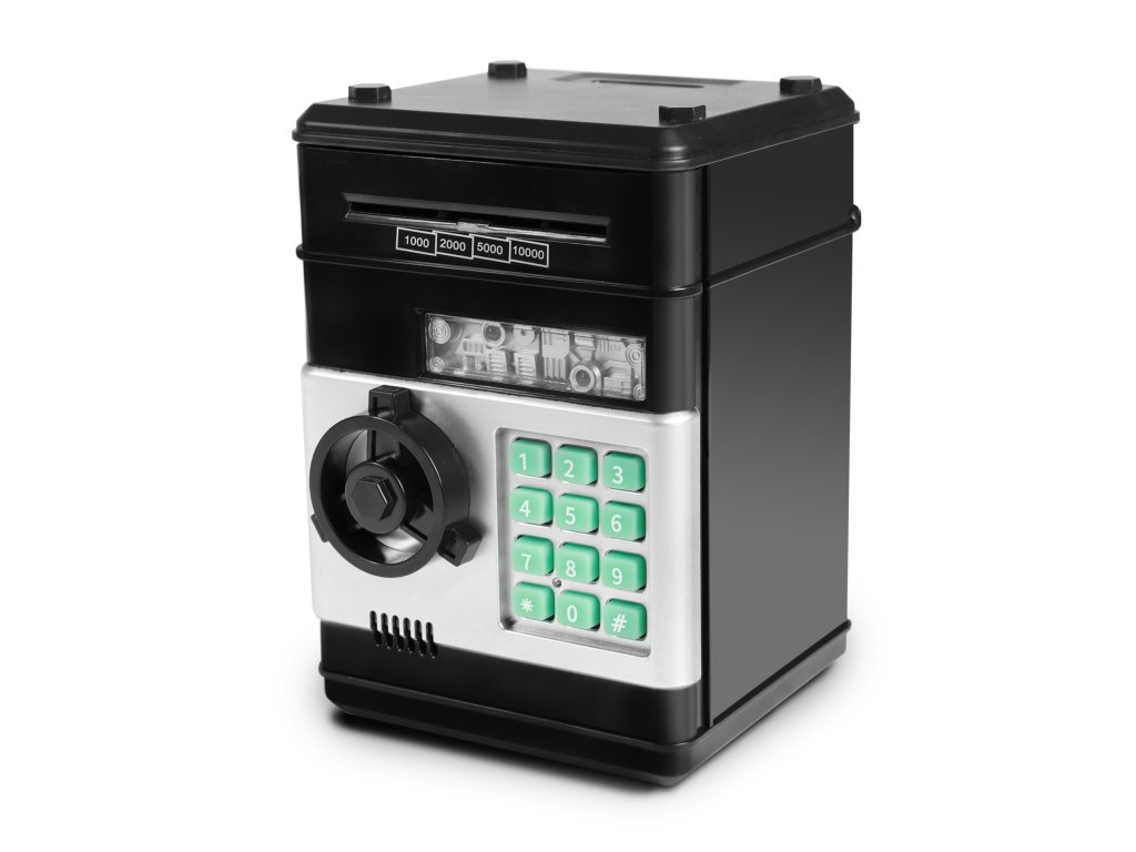 Zábavný elektronický trezor na bankovky a mince. Je velmi dobrým pomocníkem, jak naučit děti šetřit své vlastní peníze a plánovat výdaje. Tato pokladnička na peníze je modernější variantou tradičního prasátka. V případě potřeby lze peníze po zadání správného čtyřmístného PIN kódu ze sejfu odebrat. Otočením kolečka sejf otevřete. Po nastavení je možné zvolit si vlastní heslo. Pokud bude trezor dlouho otevřený, spustí se alarm. Aby byla kasička pro dítě ještě atraktivnější, byla obohacena o zajímavé světelné a zvukové efekty. Do výrobku je nutné vložit 3 ks baterií typu AA, baterie nejsou součástí balení.