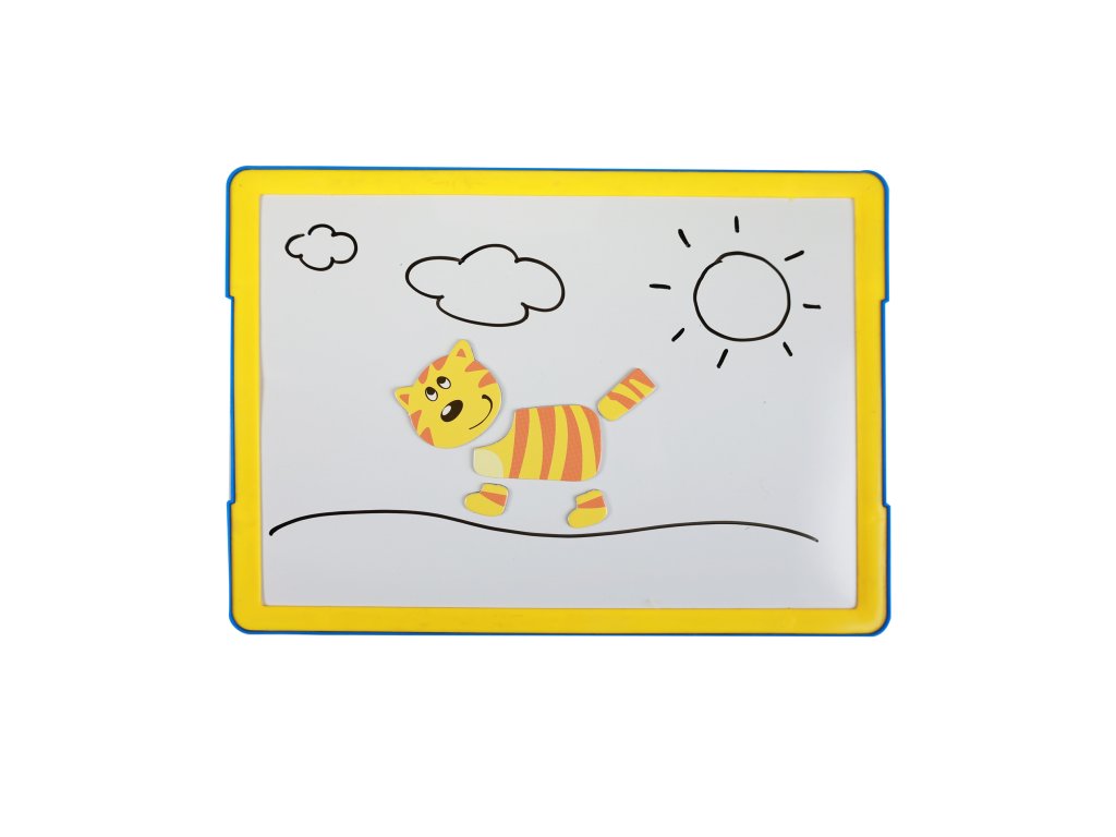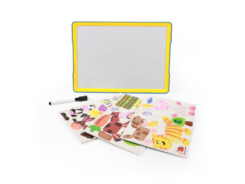 Skvělá magnetická tabulka s obrázky pro kreativní dětičky. Vytvoř si obrázek podle své fantazie! Pokud si nebudeš vědět rady, můžeš pochytit inspiraci v šablonách, které jsou vyobrazeny na zadní straně obalu. Balení obsahuje cca 105 magnetických kousků. Součástí je fix, kterým můžeš na tabulku psát či kreslit. Tabulka má rozměr 29 x 21 cm a je opatřena praktickým stojánkem na stůl. Tato hračka rozvíjí smyslové vnímání, motoriku a trpělivost.