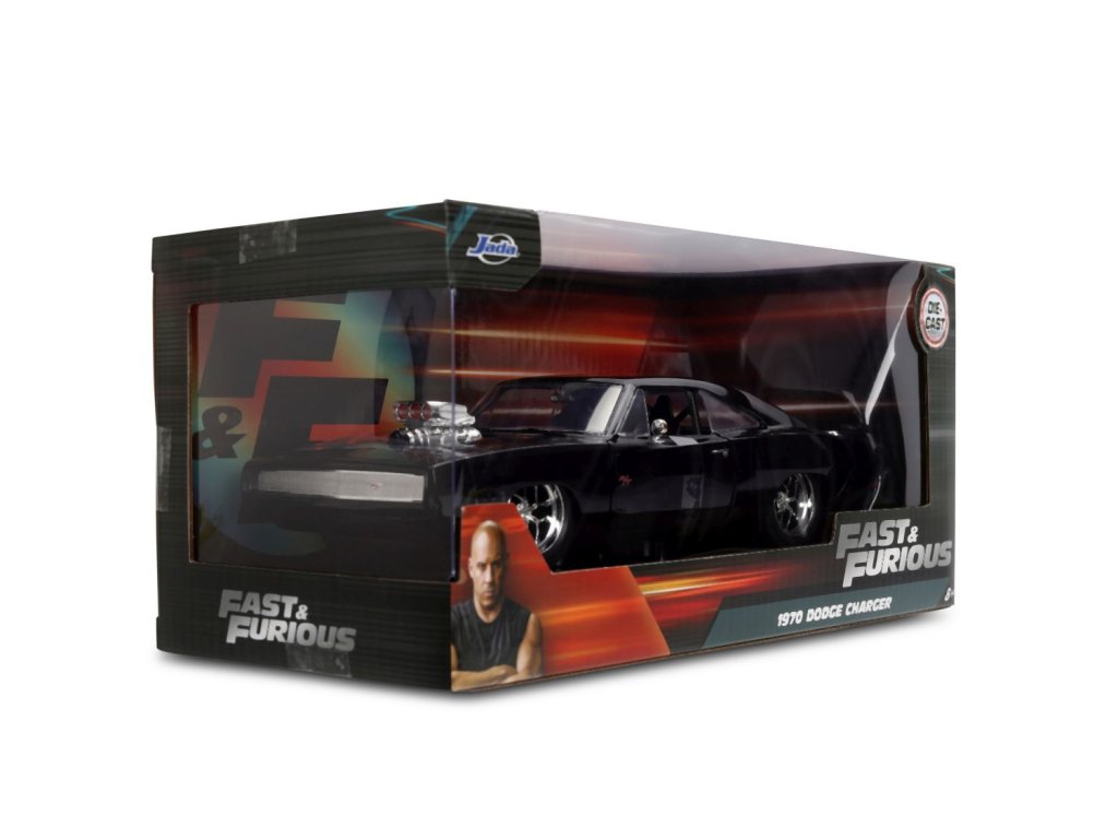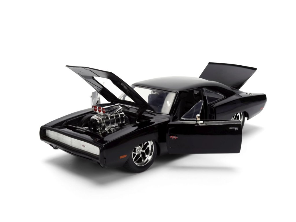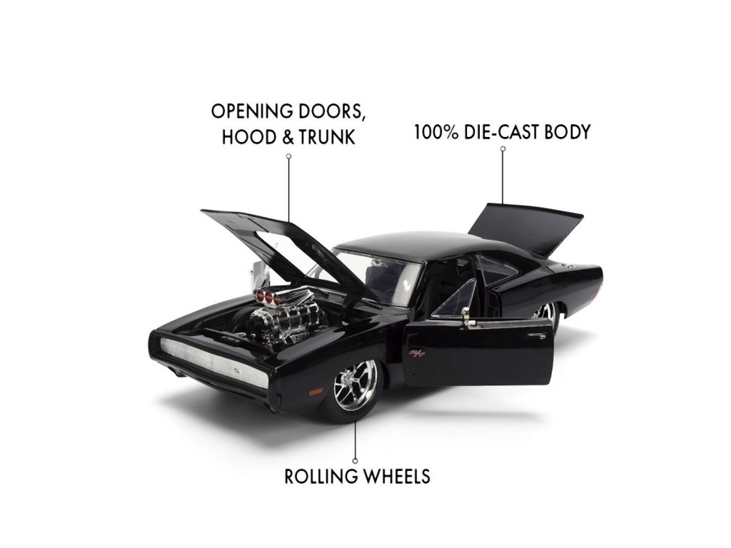 Kovový model auta Dodge Charger 1970 v měřítku 1:24 z filmu Rychle a zběsile. Na volnoběh, otevírací dveře, kufr a kapota. Velikost 21 cm.