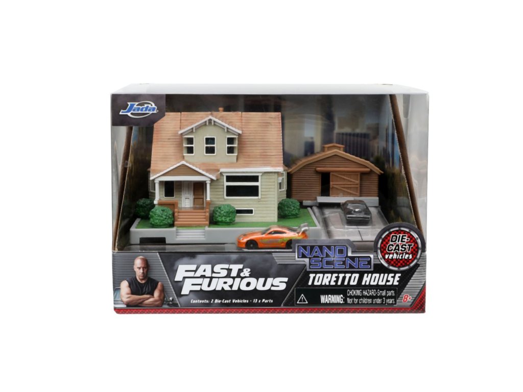 Miniaturní diorama domu a zahrady Dominika Torrety z akčního filmu Rychle a zběsile. V rozměru 14x20x20 cm s 2 kovovými auty na volnoběh (Dodge Charger a Toyota supra) a Dominika garáží. S doplňky o velikosti 4 cm. Vícebarevné.