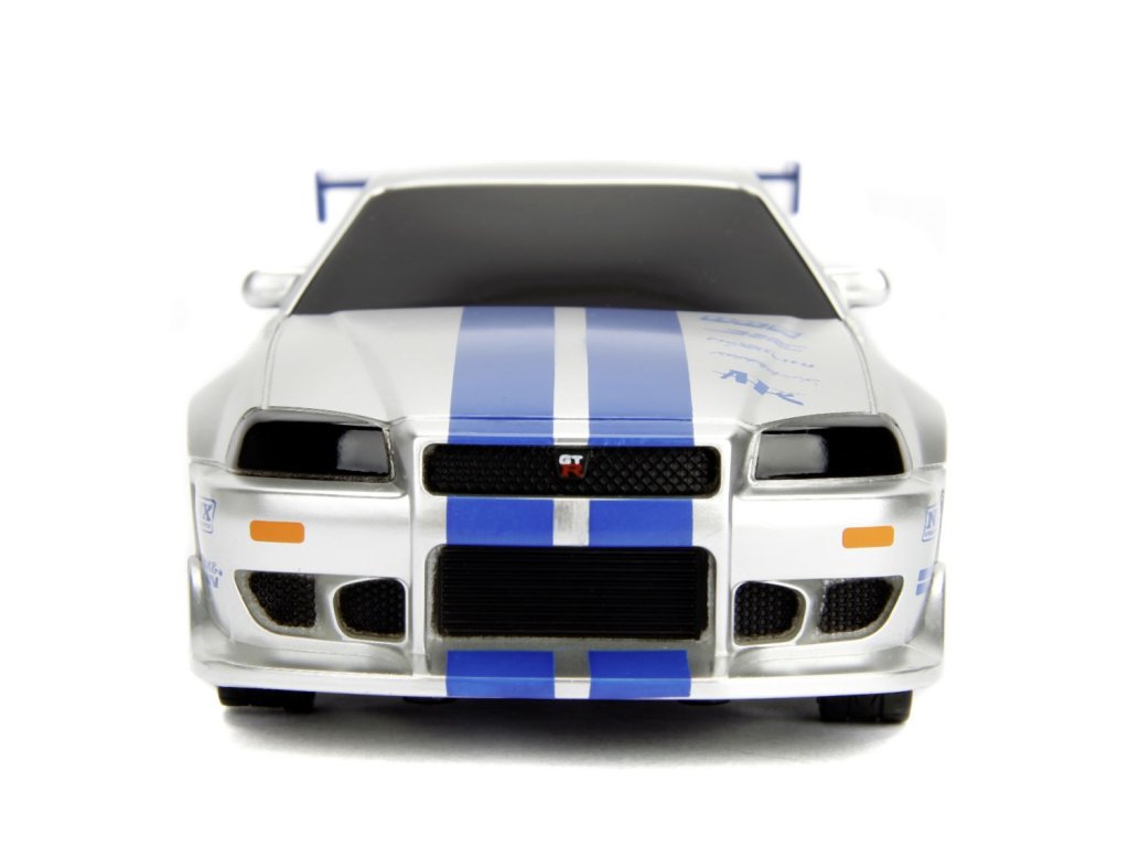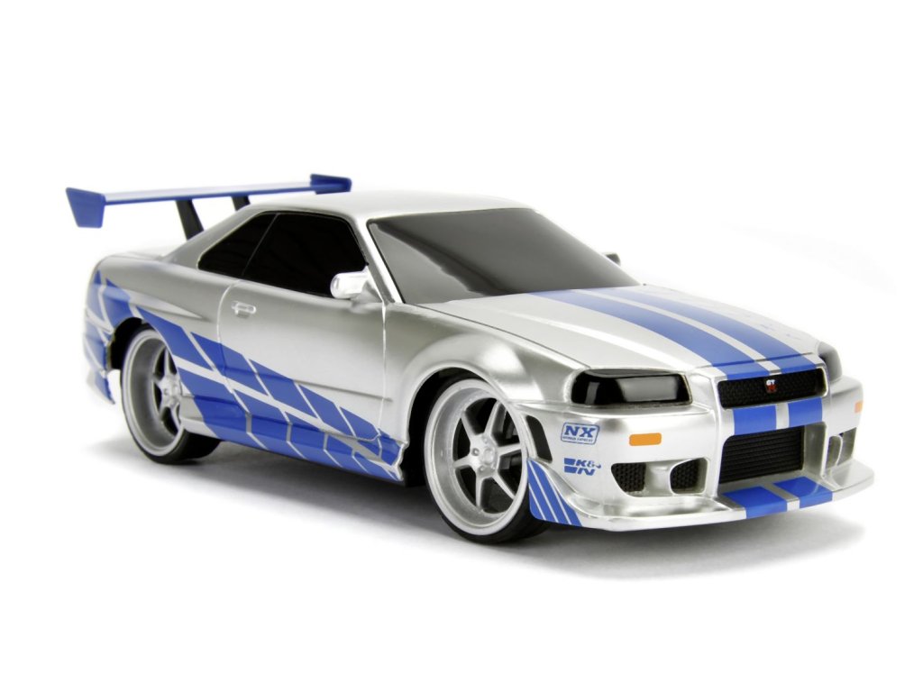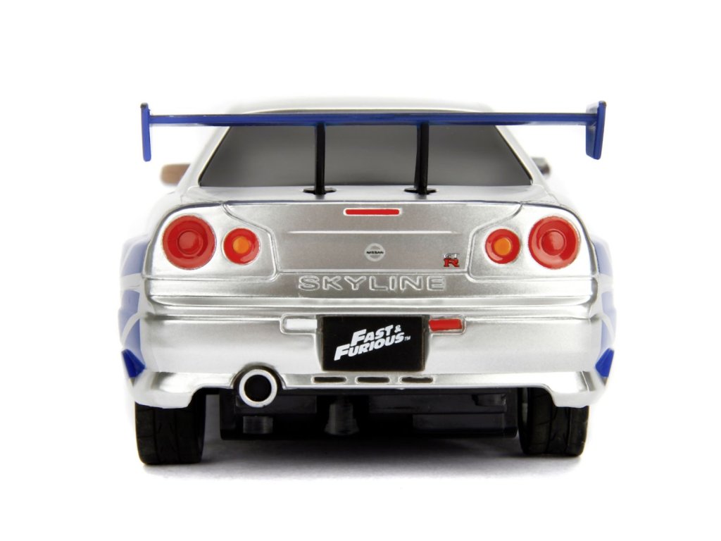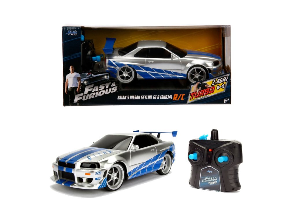 Brianovo auto Nissan Skyline GT-R (BNR34) na dálkové ovládání z akčního filmu Rychle a zběsile. 2 kanály (jezdí vpřed, vzad, vlevo a vpravo). Frekvence 2,4 GHz. Turbo funkce. Barva stříbrná a modrá. V měřítku 1:24.