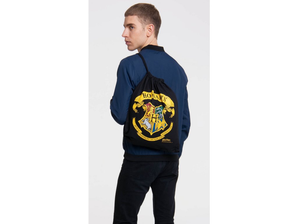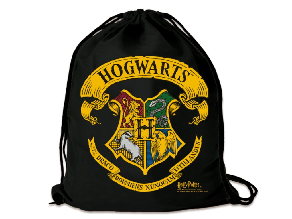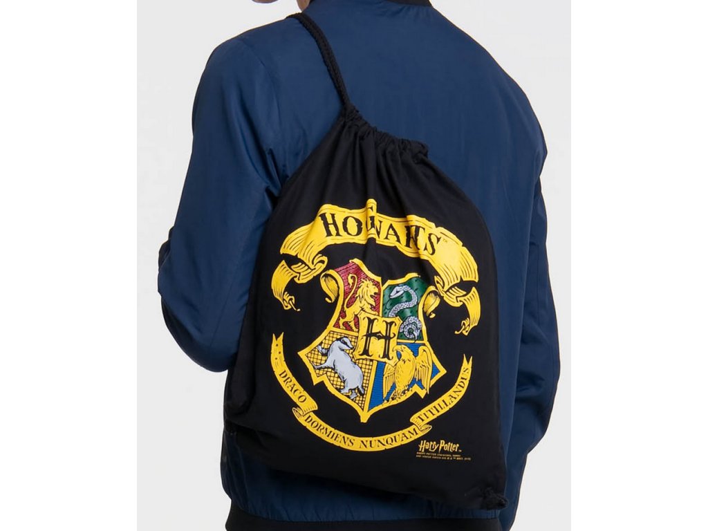 Černý pytlík se stahovacími šňůrkami a znakem školy - Bradavice. Pytlík je vhodný například na trepky, sportovní potřeby nebo sportovní oblečení.