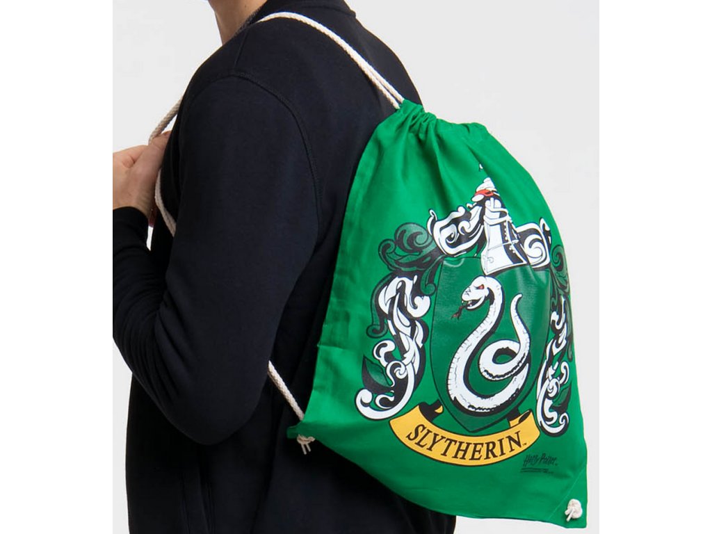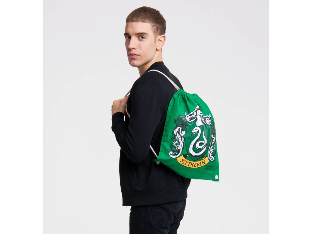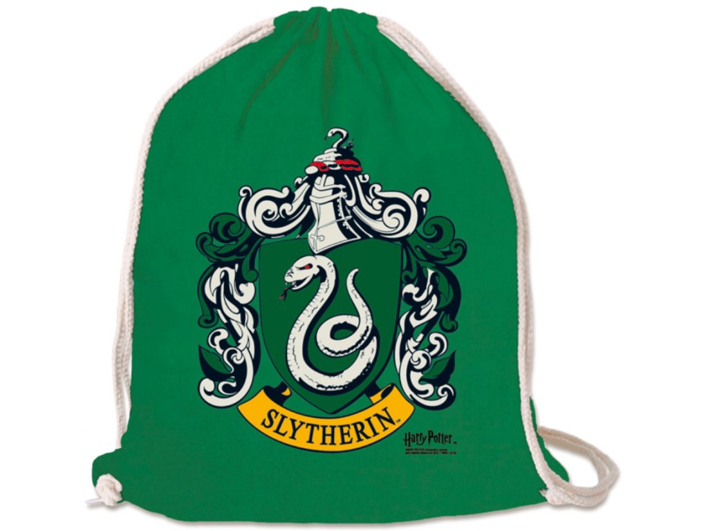 Zelený pytlík se stahovacími šňůrkami a znakem školní koleje Zmijozel. Pytlík je vhodný například na trepky, sportovní potřeby nebo sportovní oblečení.