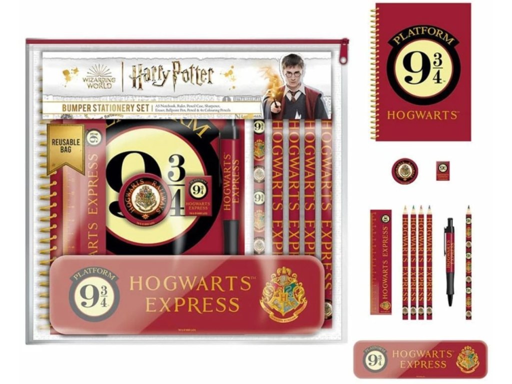 Set 8 kusů školních potřeb Harry Potter: Nástupiště 9 3/4 (sešit, pastelky, propiska, pravítko, tužka, guma, ořezavátko, penál)