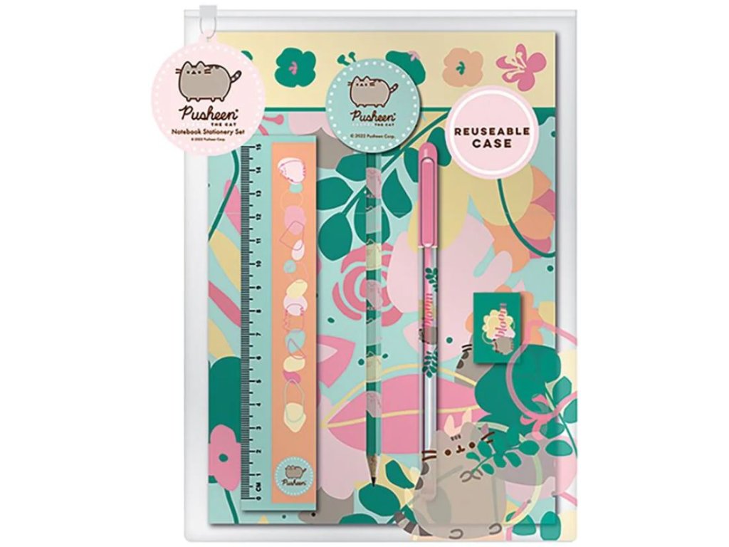 Set školních pomůcek obsahuje sešit, gumu, propisku, tužku, pravítko a strouhátko, všechny školní pomůcky jsou vyrobeny v grafice kočičky Pusheen.
