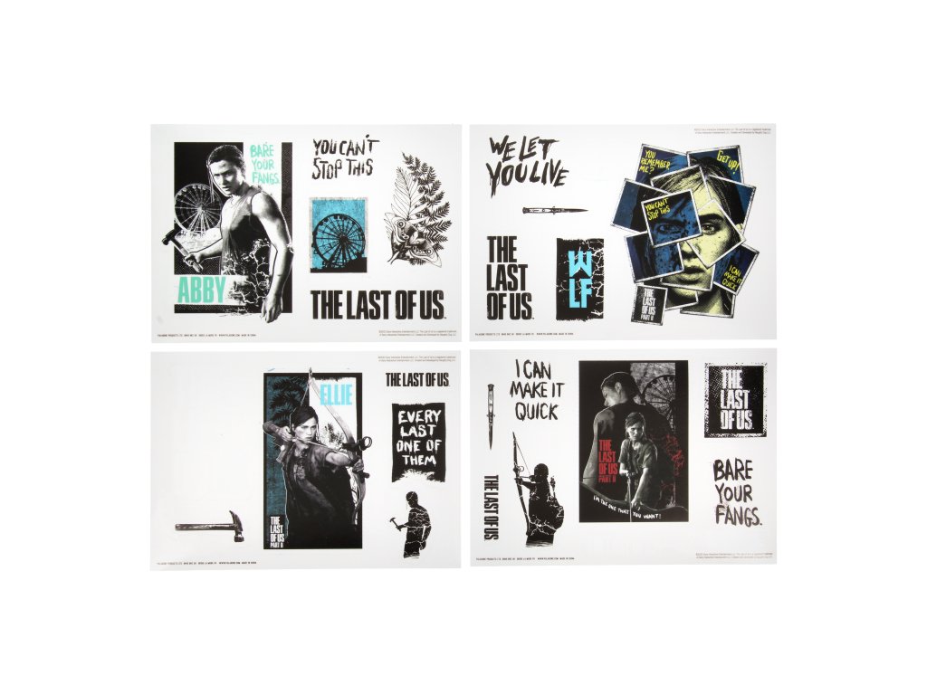 Set 4 listů samolepek na elektroniku vyvedených v grafice ikon, postav a ikonických scén ze seriálu The Last of Us. Opakovaně použitelné samolepky na notebook, tablet, smartphone atd. Balení obsahuje několik modelů samolepek. Jsou voděodolné a opakovaně použitelné.