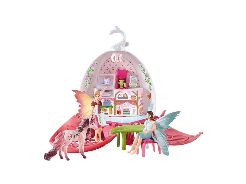 V nové květinové kavárně pro víly ve světě bayala® od společnosti Schleich® se najde vše, co víly pro odpolední pokec nad kávou potřebují. Když Eyela a Feya otevřou květinu, nasadí si Feya ze všeho nejdříve připínatelnou zástěru a v kávovaru na pultu udělá své nejlepší kamarádce Eyele čerstvou kávu. Pohodlně si přitom hoví na židli u stolu, na kterém už na ni čeká talíř s lahodným ostružinovým koláčem. Také roztomilé růžové jednorožčí hříbě s vytetovaným cupcakem a třpytivou hřívou dostane kousek ostružinového koláče z vitríny u pultu. Tento koláč mu chutná nade vše. Když je o přátele postaráno, dopřeje si Feya ještě jednu kávu. Všichni tři společně vyzdobí pult a stěny pestrými nálepkami, které lze použít opakovaně. Než odejdou, elfí kavárnu prostě zavřou, aby zde mohli strávit uvolněné odpoledne ještě jednou. Opětovně použitelné nálepky zajistí nekonečnou zábavu při zdobení. Sada obsahuje: 1x kavárna s vitrínou a pultem, 1x jídelní stůl, 1x židle, 1x elfka Feya, 1x elfka Eyela, 1x hříbě jednorožce, 1x kávovar, 1x talíř, 1x lampion, 1x pohár, 2x kousek ostružinového koláče, 1x látkový polštář, 1x zástěra. Figurky Schleich jsou mimořádně detailní, láskyplně malované a umožňují dětem hrát si a zároveň se učit. Nevhodné pro děti do 3 let. Rozměr balení: 24,5 x 19 x 8,2 cm. Doporučený věk: 5-12.
