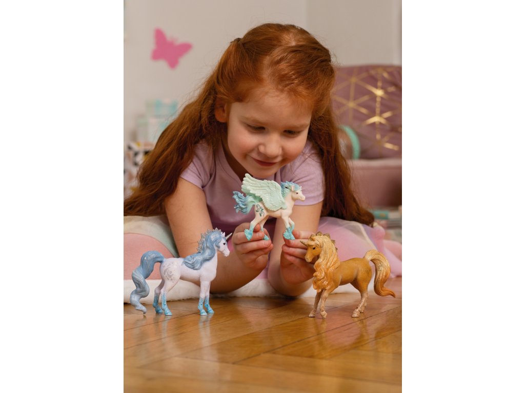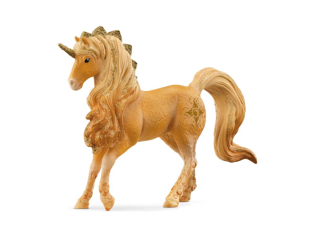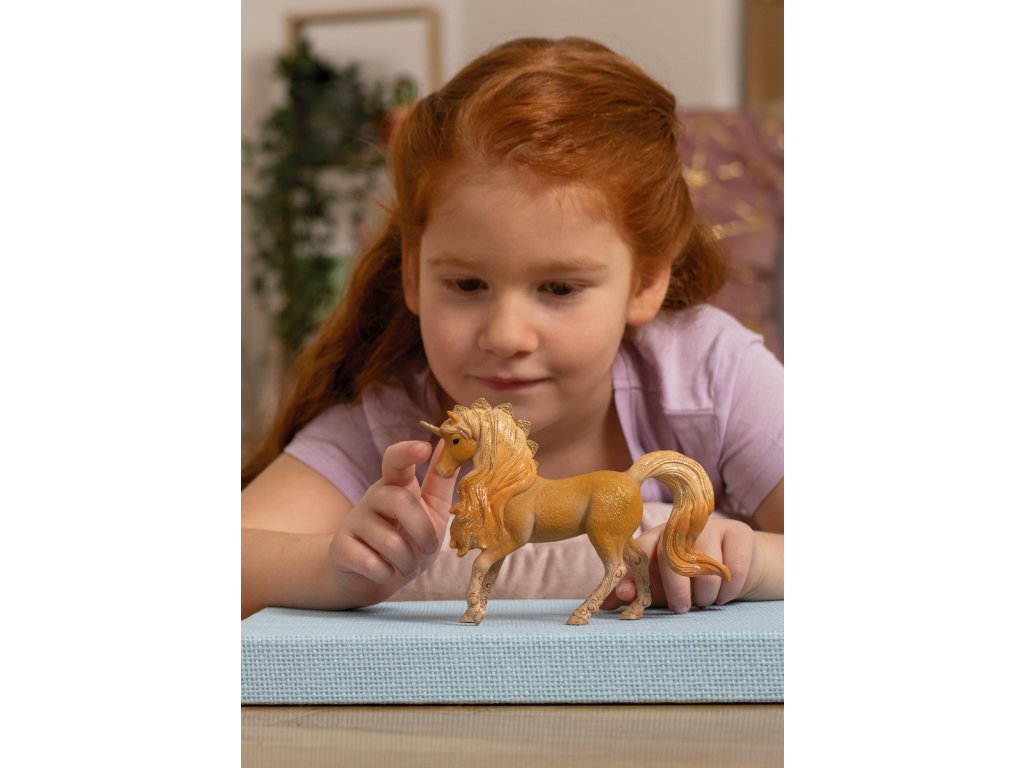 Hrdý hřebec jednorožce hrdého Apollo představuje udržitelnou solární energii. Není divu, protože se svou zlatohnědou srstí a zlatými pilovitě tvarovanými vlnami na krku září jasně jako slunce. Netrpělivě švihá svým bujným kudrnatým ocasem sem a tam a klape kopýtky: Kde jsou klisna jednorožce Flowy a hříbě jednorožce Stormy? Chtěli společně vyrazit na rodinný výlet a prozkoumat krásný svět BAYALA®! Ale možná mu bude dělat společnost někdo jiný? Velikost: 16,4x11,8x3,9cm. Věk: 3+