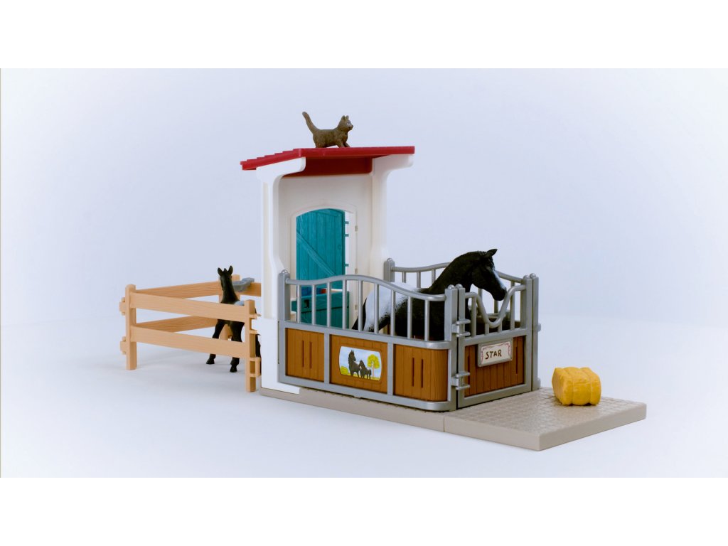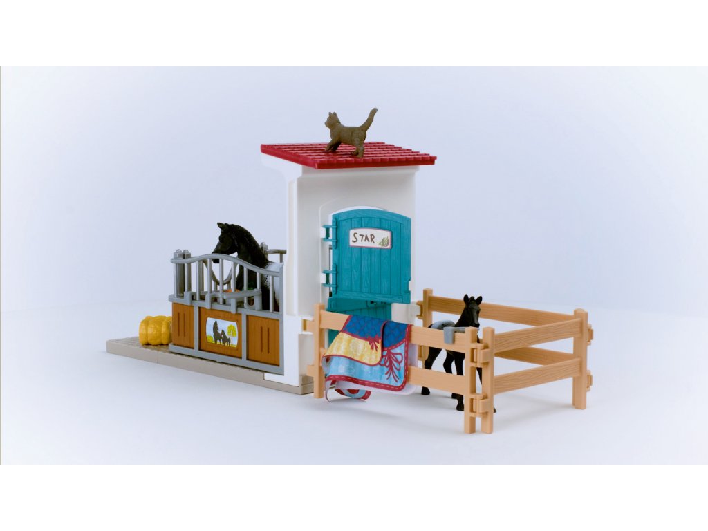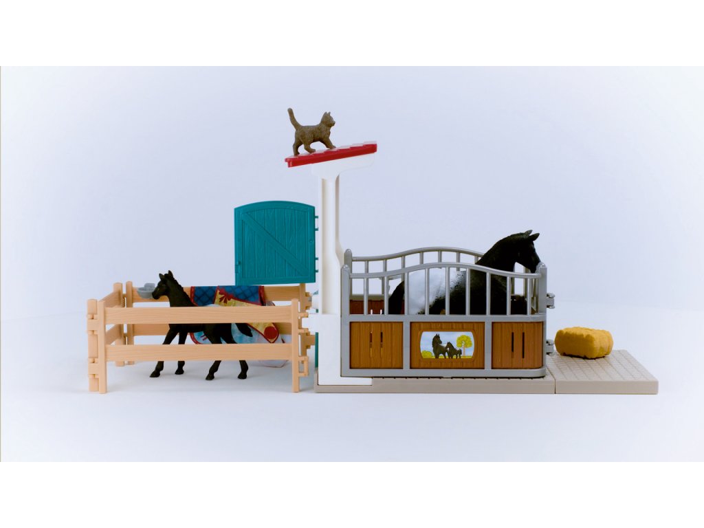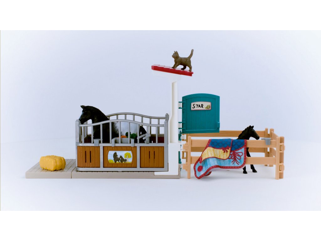 Není divu, že se klisna plemene Appaloosa a její hříbě cítí v boxu tak dobře. Je tu tak útulno a mají tady všechno, po čem jejich srdce touží. Krmení je v držáku na seno a měkké deky pro koně jsou připravené, takže je jen stačí dát pod sedlo. Zatímco klisna a hříbě pijí vodu z napáječky, kočka jim dělá společnost. Uvelebila se na balíku slámy. O mrkev, kterou může okusovat jen kůň, ale zájem nejeví. Možná se oba vydají do ohrady, aby se společně pobavili. Rozměry: 24,5x19x8,2cm. Vhodné pro děti od 3 let.