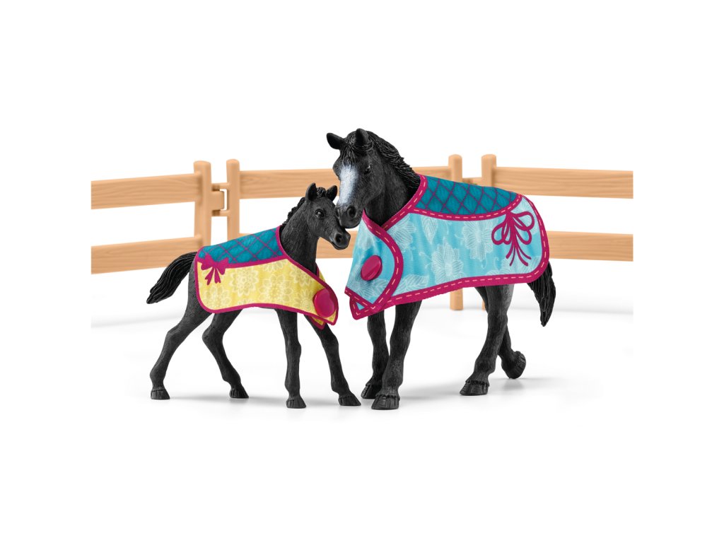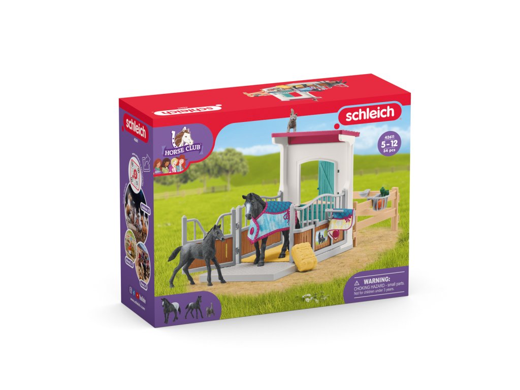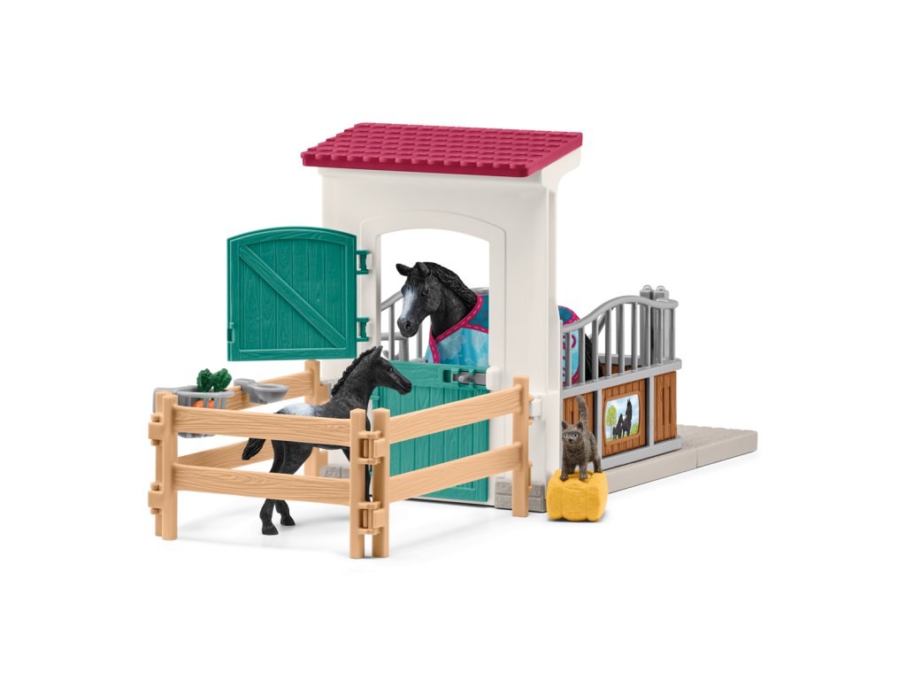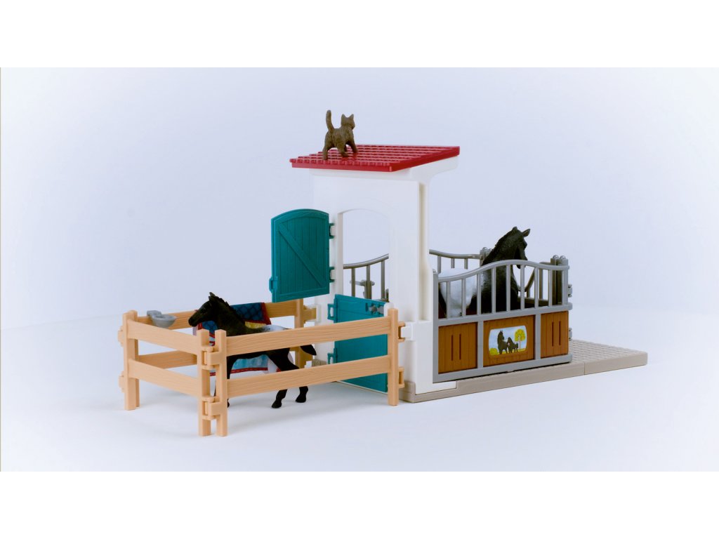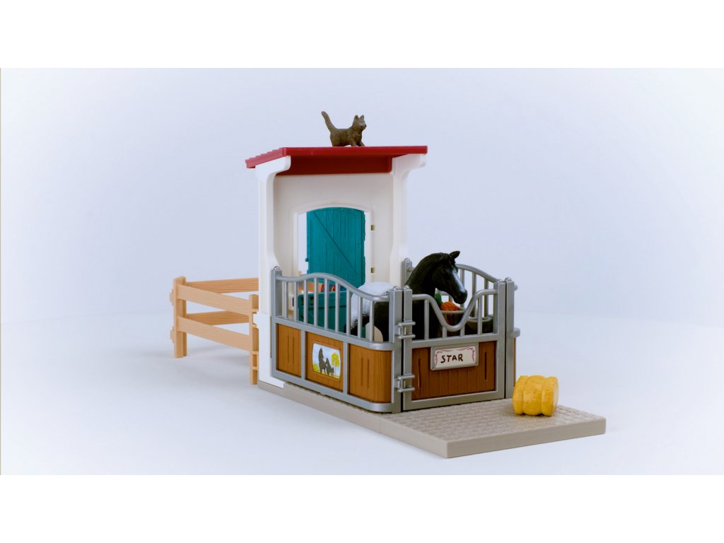 Není divu, že se klisna plemene Appaloosa a její hříbě cítí v boxu tak dobře. Je tu tak útulno a mají tady všechno, po čem jejich srdce touží. Krmení je v držáku na seno a měkké deky pro koně jsou připravené, takže je jen stačí dát pod sedlo. Zatímco klisna a hříbě pijí vodu z napáječky, kočka jim dělá společnost. Uvelebila se na balíku slámy. O mrkev, kterou může okusovat jen kůň, ale zájem nejeví. Možná se oba vydají do ohrady, aby se společně pobavili. Rozměry: 24,5x19x8,2cm. Vhodné pro děti od 3 let.
