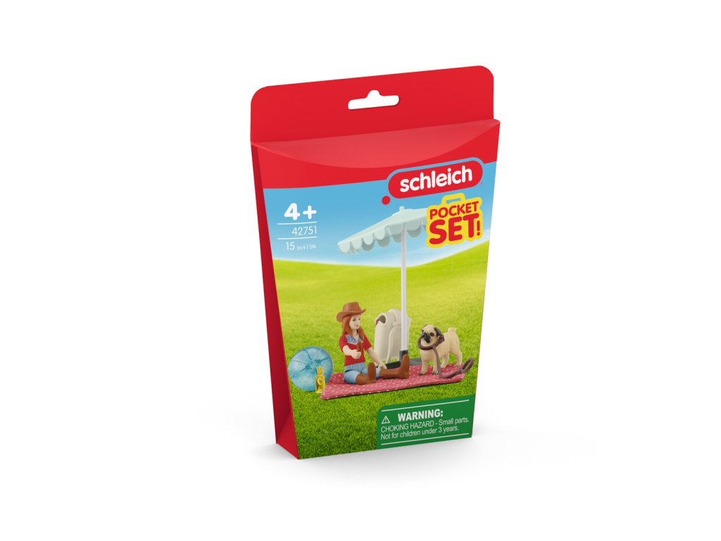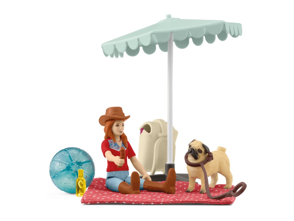 Hannah vezme svého mopsíka na výlet k jezeru. Roztáhne velký slunečník a rozprostře měkkou deku. V horký den jako je ten dnešní, je výlet k jezeru to pravé ořechové. Hannah a její mopsík si to myslí taky. Oba skočí do chladné vody a spokojeně se cákají. Hannah naštěstí nezapomněla vzít nafukovací míč. Rádi si s ním hrají. Po návratu na pevninu si udělají pohodlí ve stínu pod slunečníkem a odpočívají. Hannah raději drží mopsíka na vodítku, protože čas od času rád uteče. Vodítko je odnímatelné. Figurka Hannah je plně pohyblivá. Obsah: 1× figurka Hannah, 1× klobouk, 1× mopsík, 1× pikniková deka, 1× batoh, 1× slunečník, 1× plážový míč, 1× láhev, 1× klobása, 1× vodítko. Hrací sada mini figurek se dá použít samostatně nebo v kombinaci se stávajícími výrobky HORSE CLUB. Tahle hrací sada je součástí sady POCKET SET a je vhodná pro děti od 4 let. Rozměry balení: 19,9 x 10 x 5,8 cm.