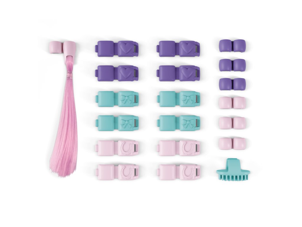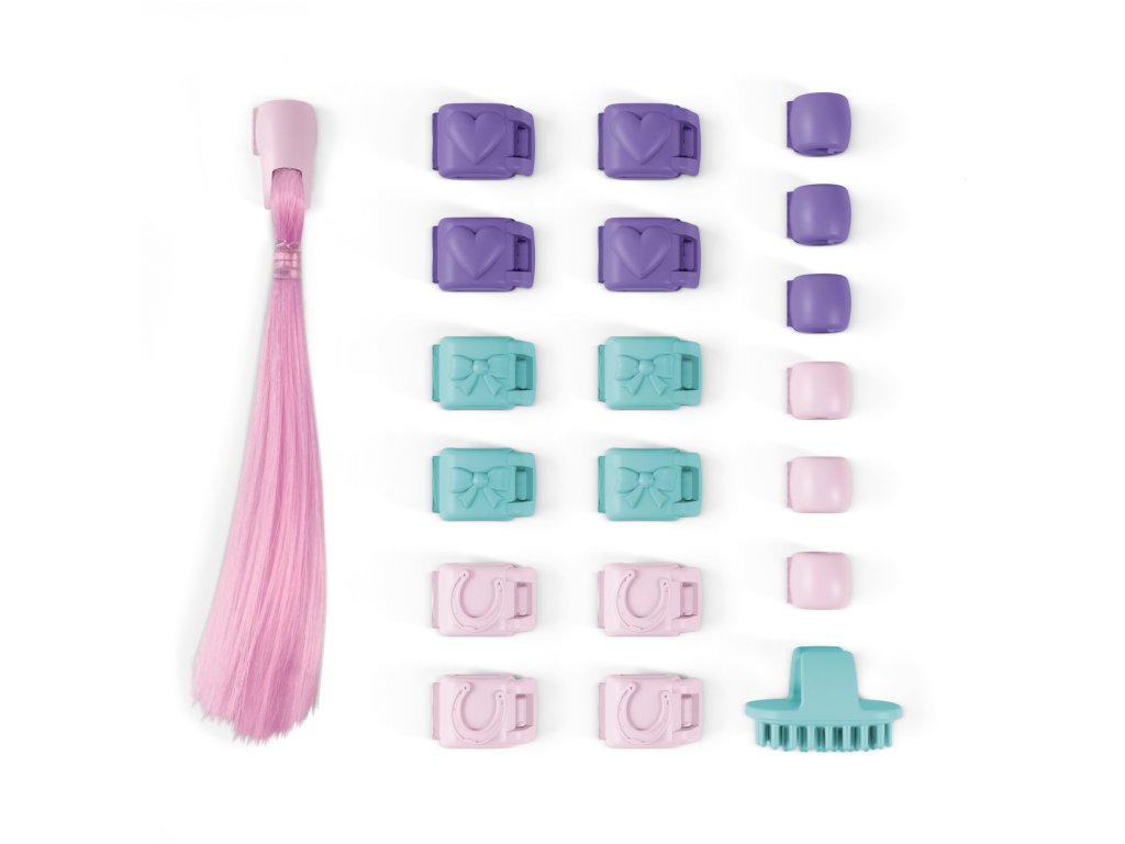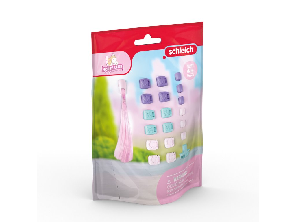 Mátově zelená, levandulová nebo světle růžová: pastelové odstíny doplňků do hřívy z kolekce Schleich® HORSE CLUB Sofia's Beauties sluší klisnám i hřebcům všech plemen. Jsou ideálním doplňkem k novým koním Schleich®, kterým můžeš kartáčovat hřívu i ocas. Aby barevné sponky zůstaly na svém místě i po těch nejdivočejších skocích přes překážky a ohrady, je potřeba hřívu koně předem důkladně vyčesat. Nakonec přidej růžový příčesek a styling na party bude dokonalý! Juchů! Účes je hotový, party ve stáji může začít! Sada obsahuje: 1× korálky do hřívy, 1× sponky do hřívy, 1× příčesek, 1× kartáč. Rozměry: 16 x 12,5 1,5 cm Věk: 3+