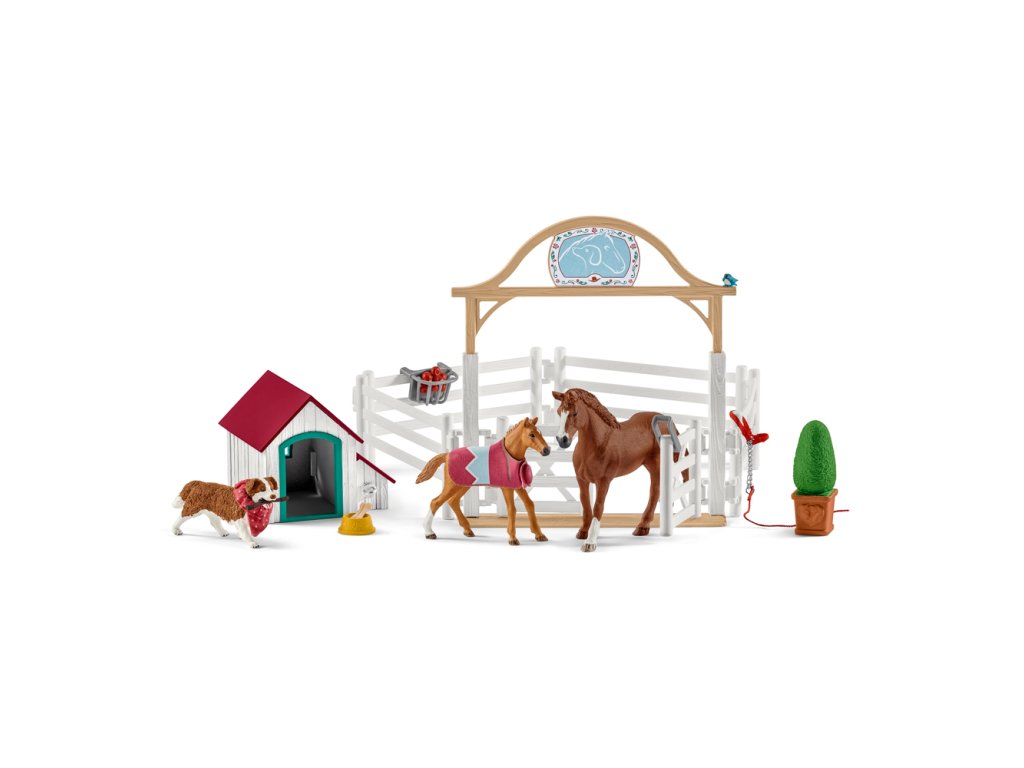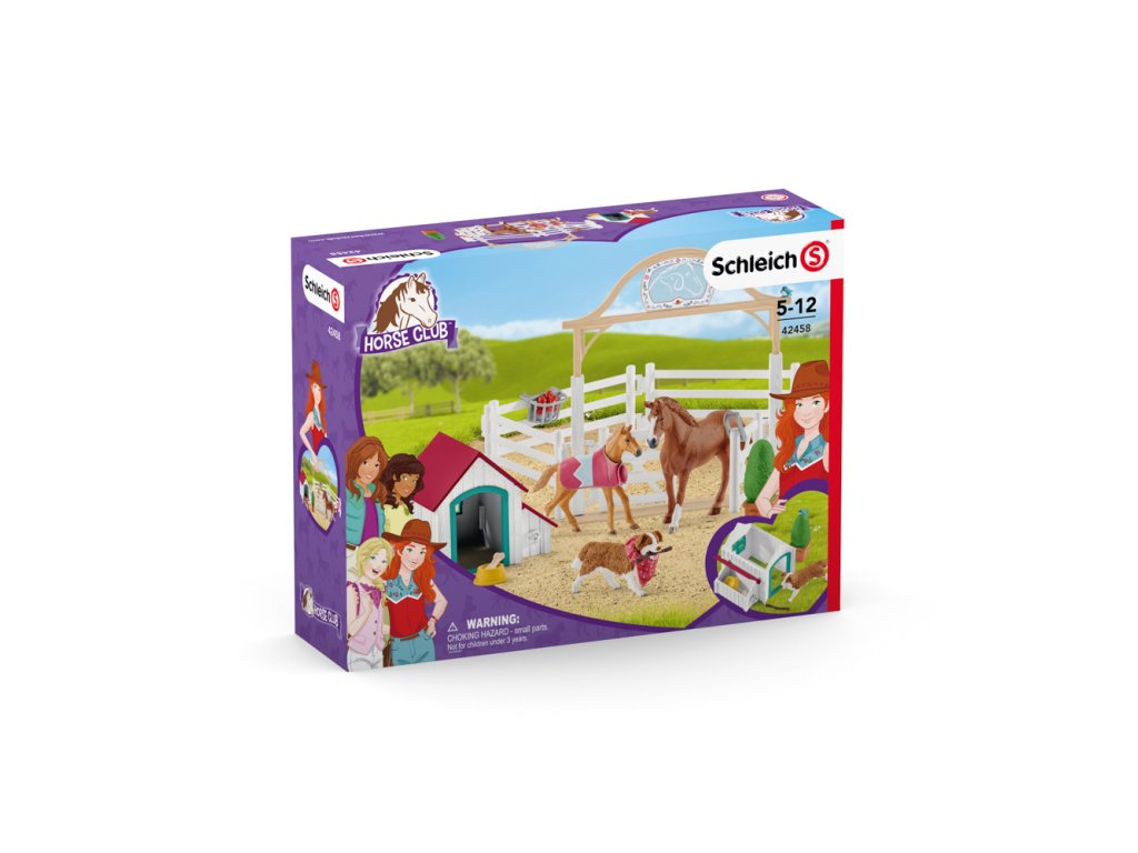 Dobrodružství pokračuje! V Lakeside jsou dočasně dva noví koně! Hannah a její pes Ruby šťastně pozdraví klisnu Appaloosa a hříbě. Hannah má trik, aby se naklonila na kobylku: rozptýlí ji lahodným jablíčkem. A pak už si užívají pohodu ve výběhu, kde si koně mohou v klidu zvykat na nové prostředí. Doufejme, že tu zůstanou dlouho! Výběh lze snadno kombinovat s velkým jezdeckým centrem a jinými produkty. Ploty lze navzájem připojit v obou směrech! Střecha u psí boudy je odnímatelná, stejně jako deka a ohlávka na koně. Vstupní brána se otevírá a zavírá. Figurky jsou výhradně k dispozici pouze v této sadě! Všechny figurky Schleich® jsou modelovány v nejjemnějším detailu, láskyplně malované a povzbuzují děti ke hře a zároveň k výuce. Sada překážek je vhodná jak pro malé, tak pro velké figurky koní. Rozměr rozbalené sady: 40 x 30 x 20 cm. Rozměr balení: 24,5 x 6,6 x 19 cm. Nevhodné pro děti do 3 let. Doporučený věk: 5-12.