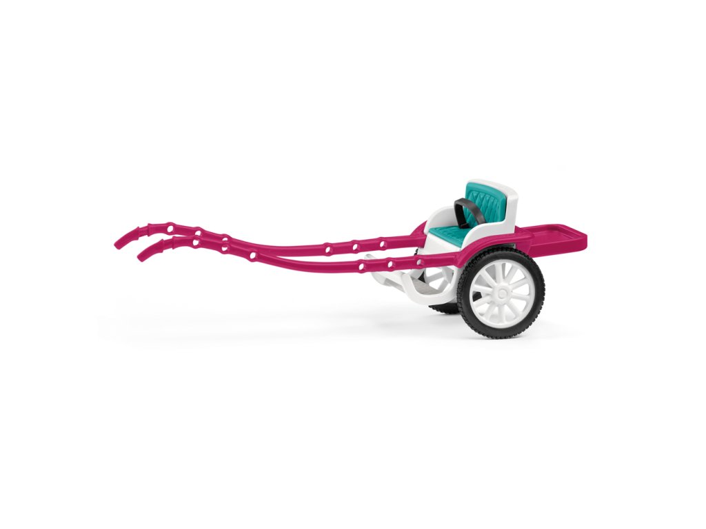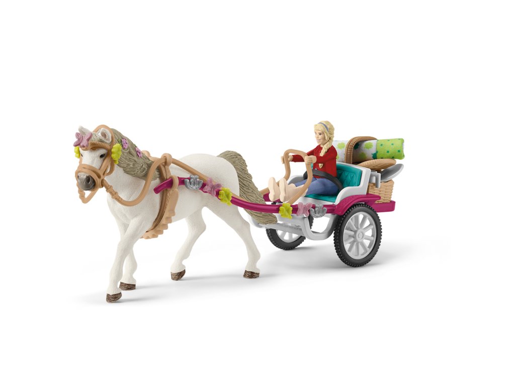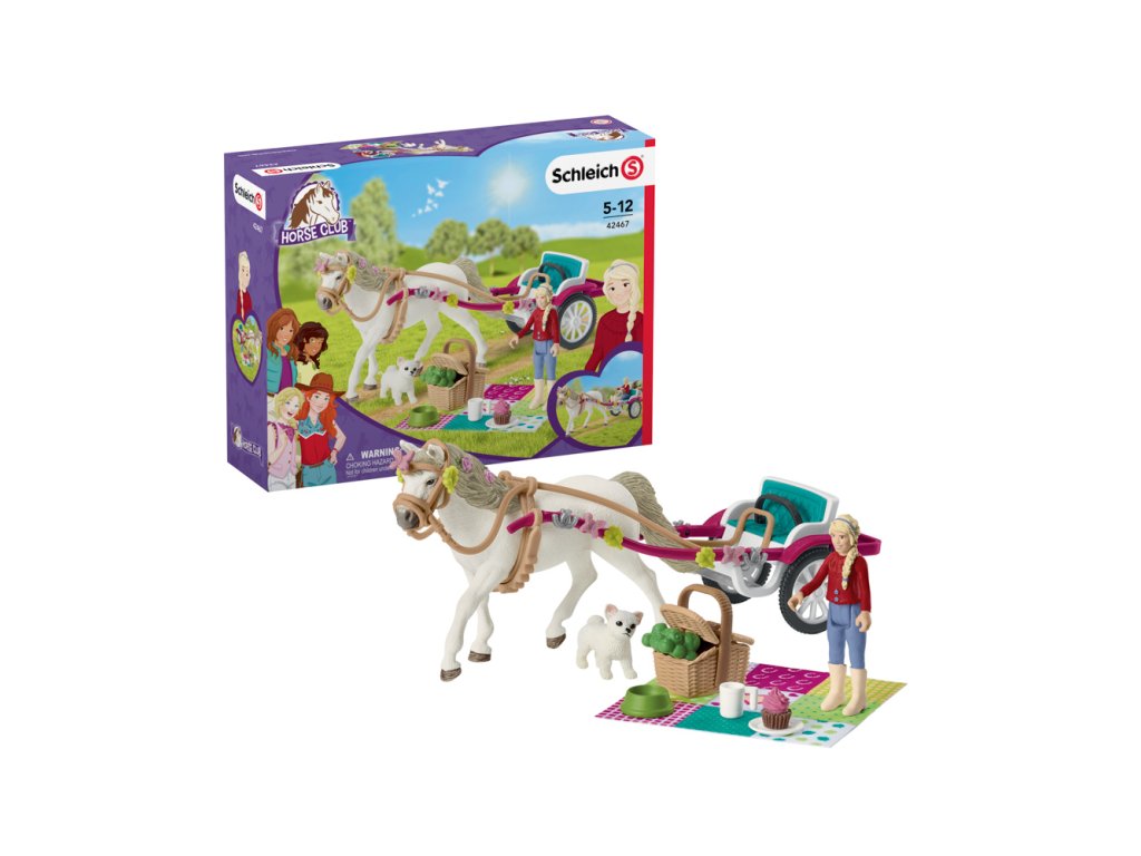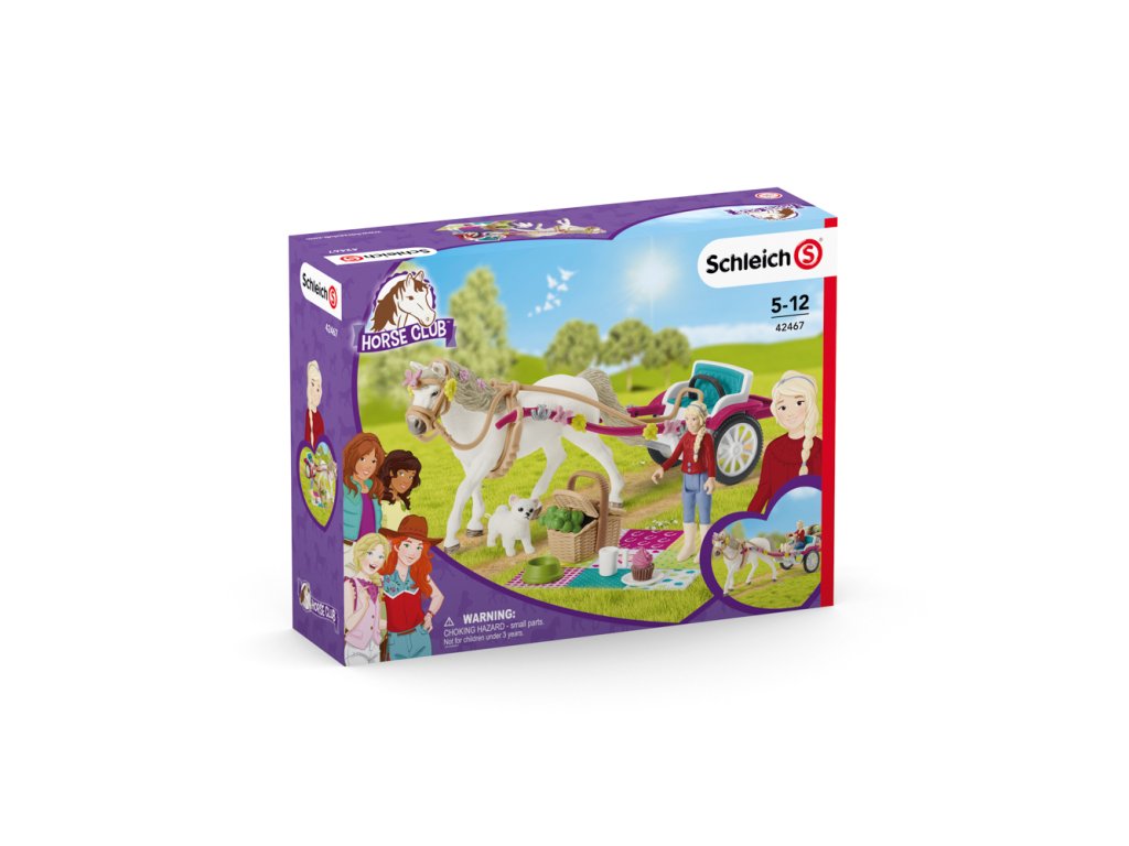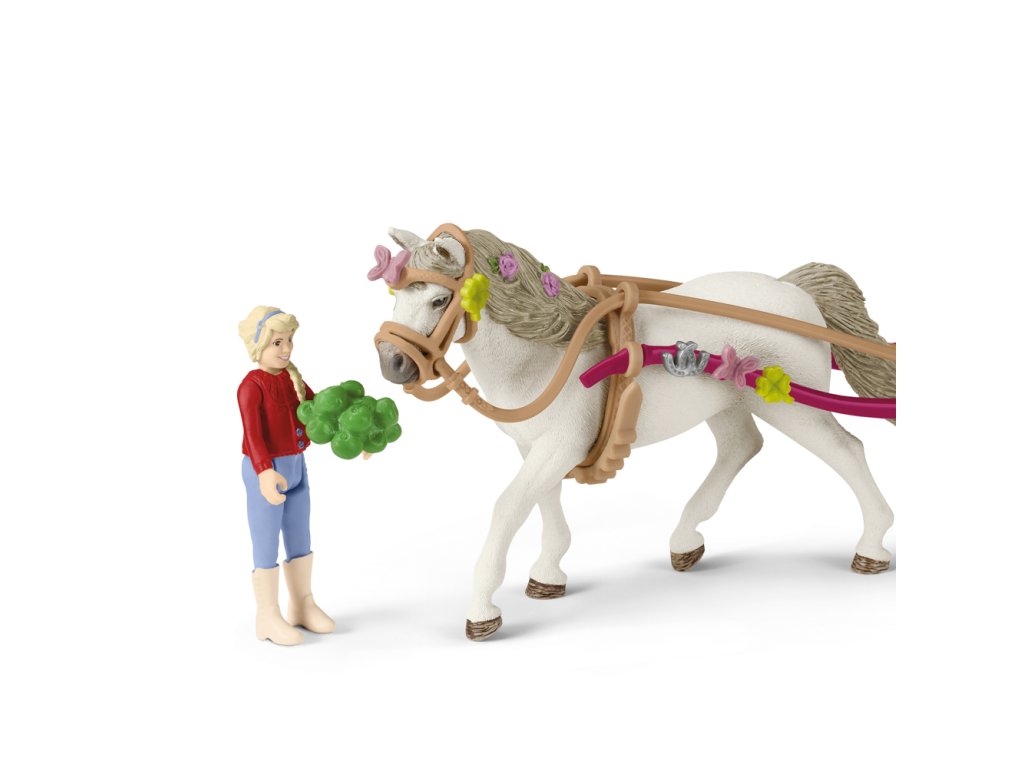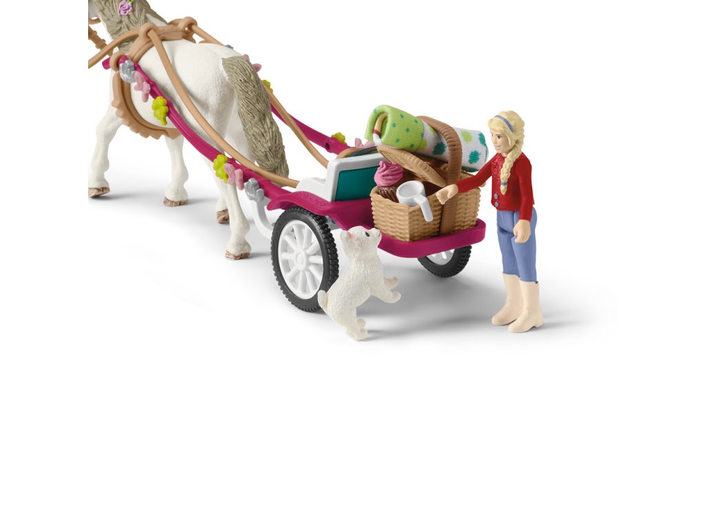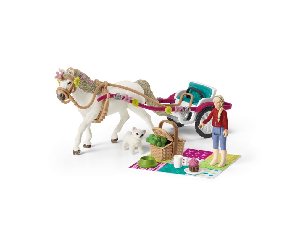 Kočár pro koňskou přehlídku Schleich® Horse Club je láskyplně ozdoben čtyřlístky, podkovami a motýly. Clara také přidala krásné dekorace do ohlávky svého poníka Connemara. Na praktické poličce je uložena měkká přikrývka a dobře zásobený piknikový koš. Během koňské přehlídky může Clara pohodlně sedět na přikrývce, mazlit se se svým štěnětem čivavy a užít si piknik. Clára může sedět i stát. Uzda je odnímatelná. Figurky Schleich® jsou modelovány do nejjemnějších detailů, aby pomohly dětem učit se při hraní. Nevhodné pro děti do 3 let. Doporučený věk: 5-12 let.