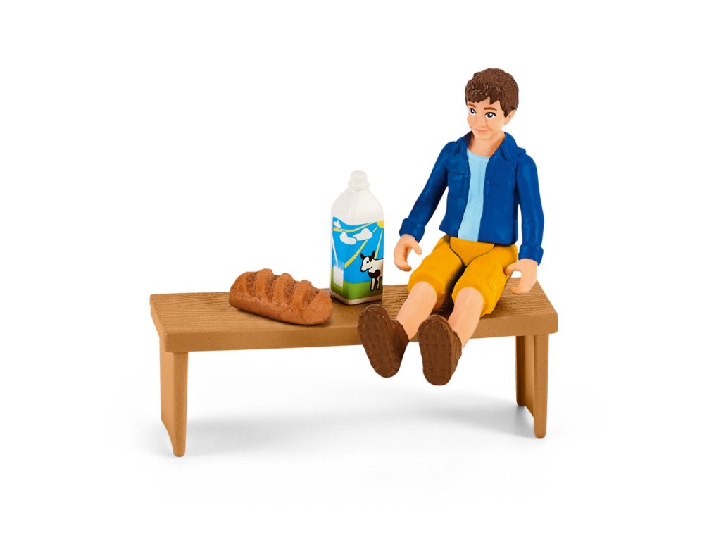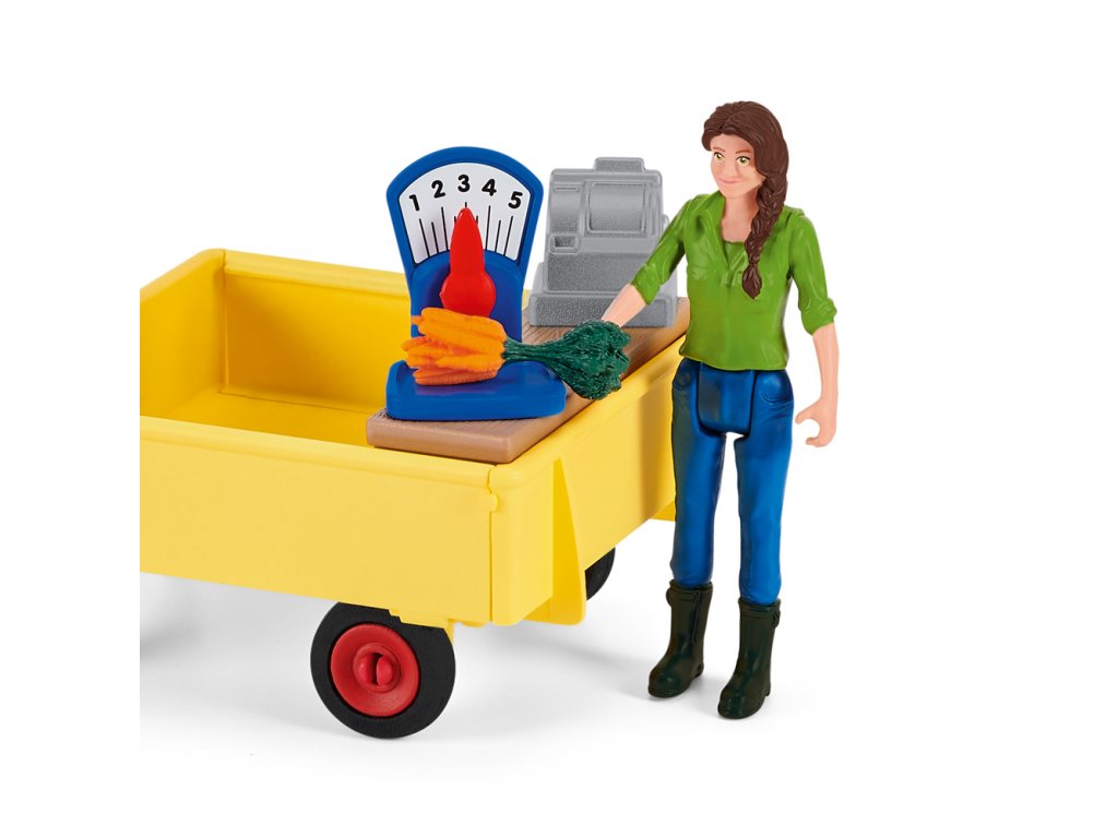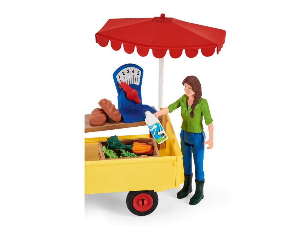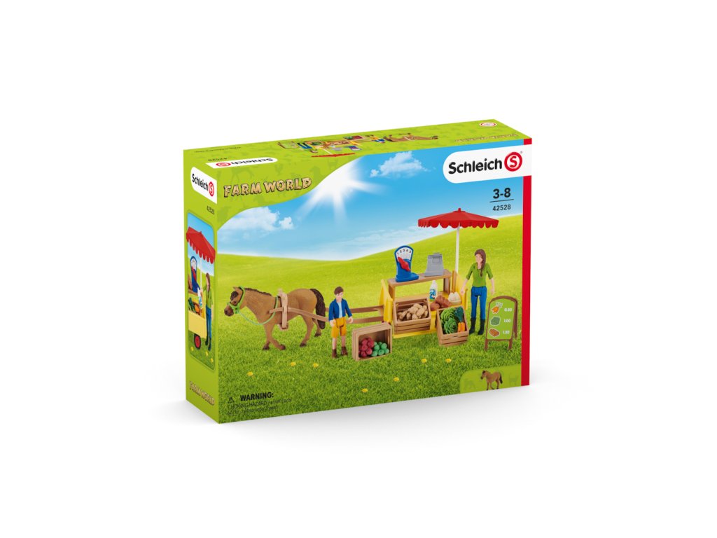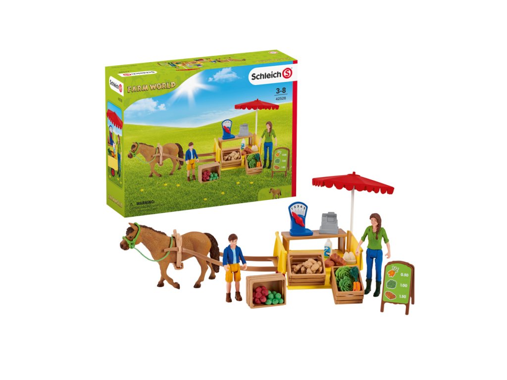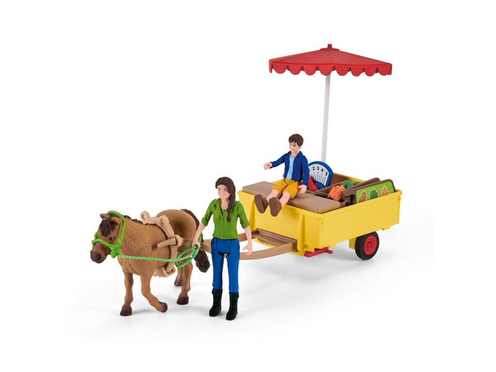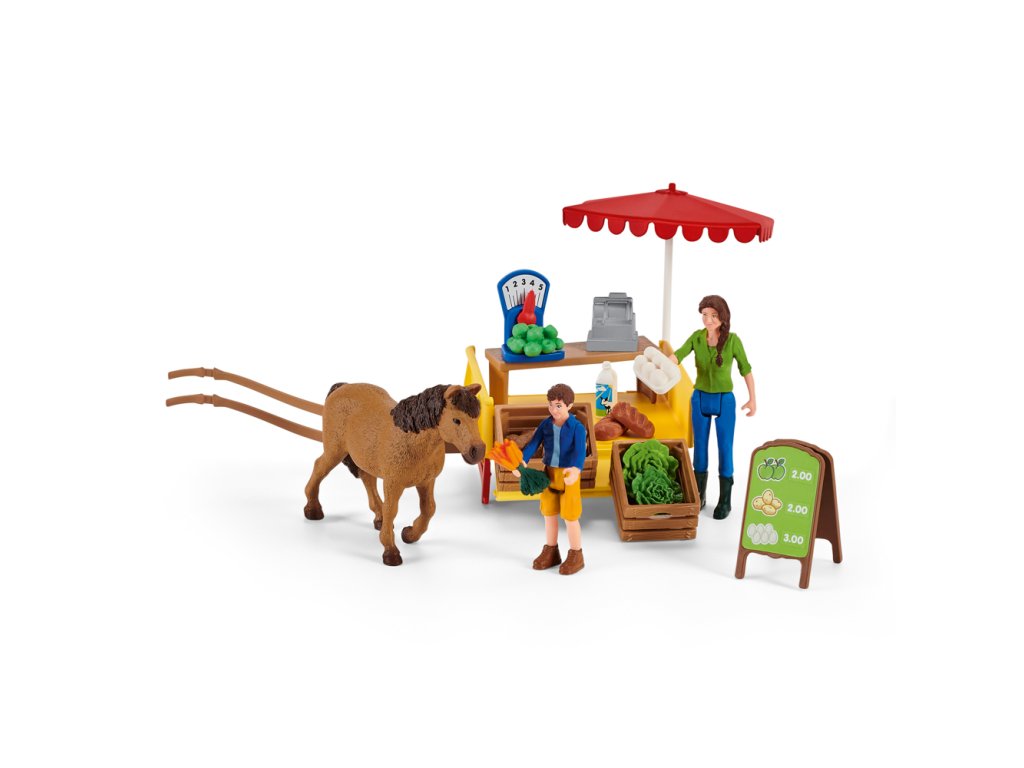 Ben a jeho matka Laura naloží mobilní farmářský stánek Schleich® FARM WORLD čerstvými produkty přímo z jejich farmy. Na jejich vůz se vejdou šťavnatá jablka, čerstvě snesená vejce, čerstvý salát, brambory z pole, chlazené mléko a křupavý chléb. Jakmile je vše naloženo, zapřáhnou svého pracovitého poníka k vozu a vydají se prodávat své produkty. Mají s sebou dost jablek?