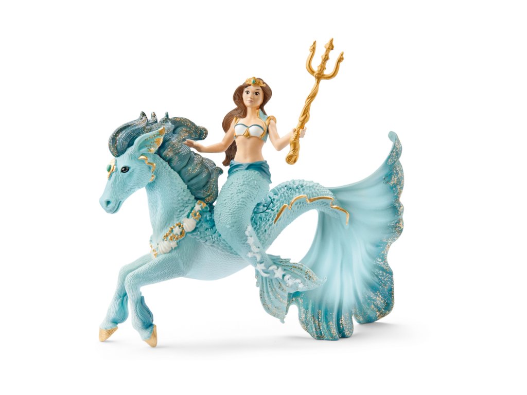Korunní princezna Eyela na svém krásném podvodním koni na návštěvě Meamare! Majestátní Eyela je korunní princezna všech elfů slunce v bayala® a nejlepší kamarádka elfí víly Feyi. Obě byly kouzelníkem přeměněny na mořské panny a nyní se společně potápějí za svými přítelkyněmi mořskými pannami. Figurka je součástí tematického světa bayala® od společnosti Schleich® a je vhodná pro děti ve věku 5-12 let. Figurka má pohyblivá ramena a spoustu třpytek. Sada obsahuje 1x figurka princezny, 1x podvodní kůň, 1x trojzubec. Nevhodné pro děti do 3 let.