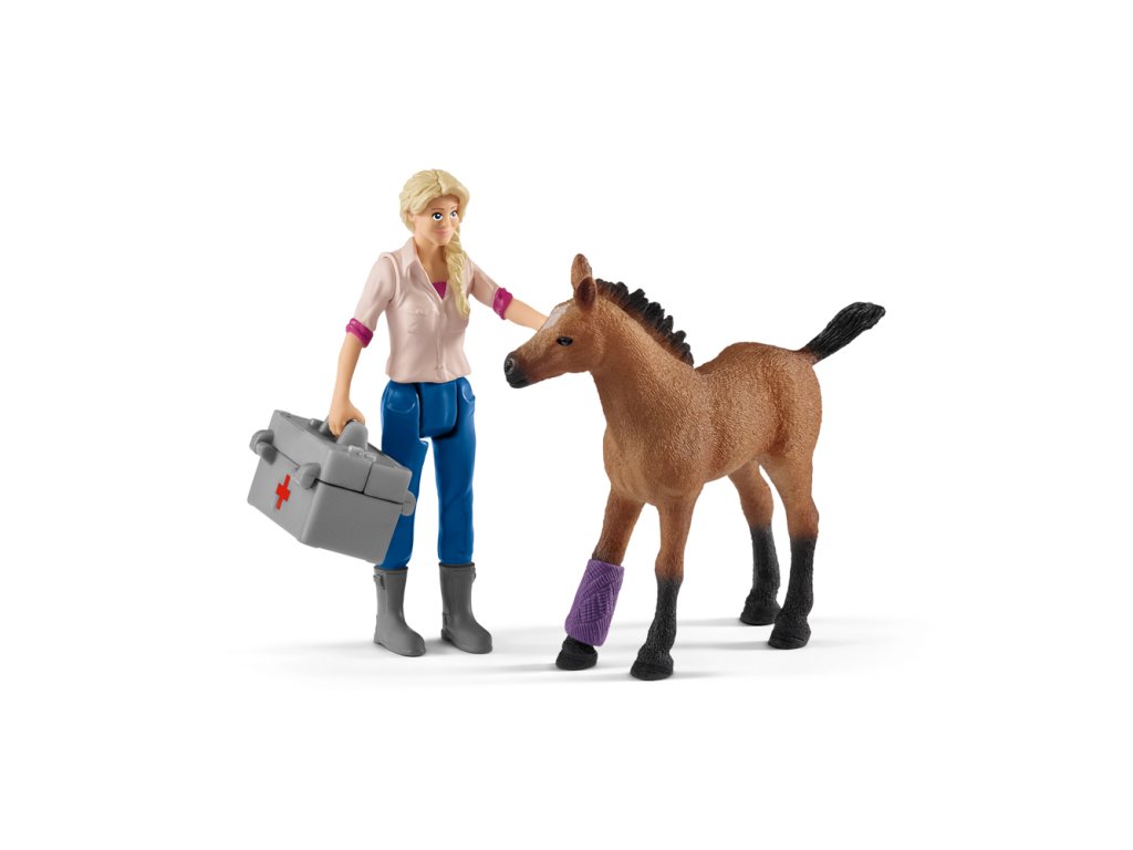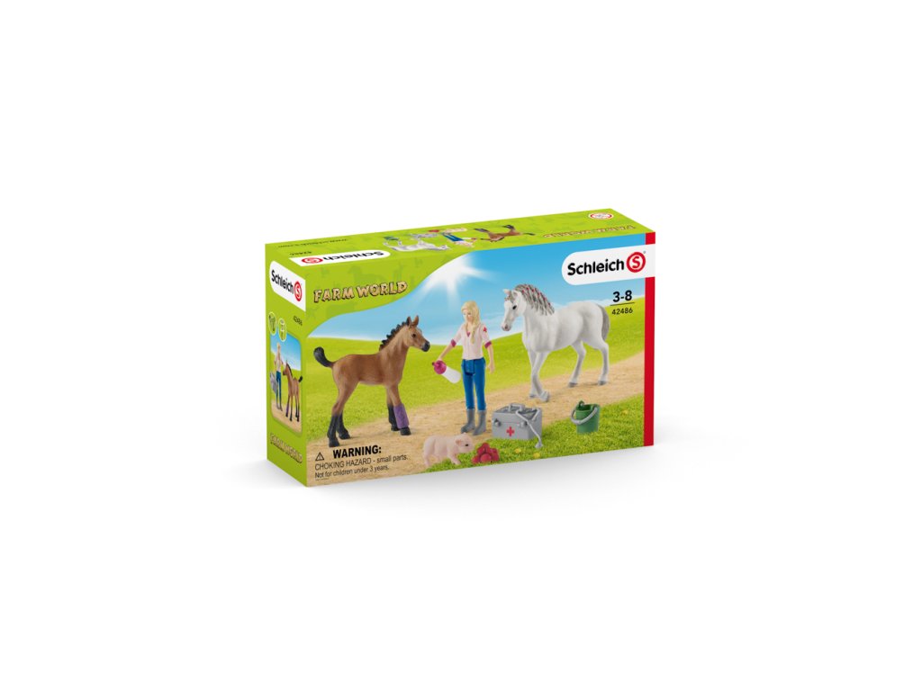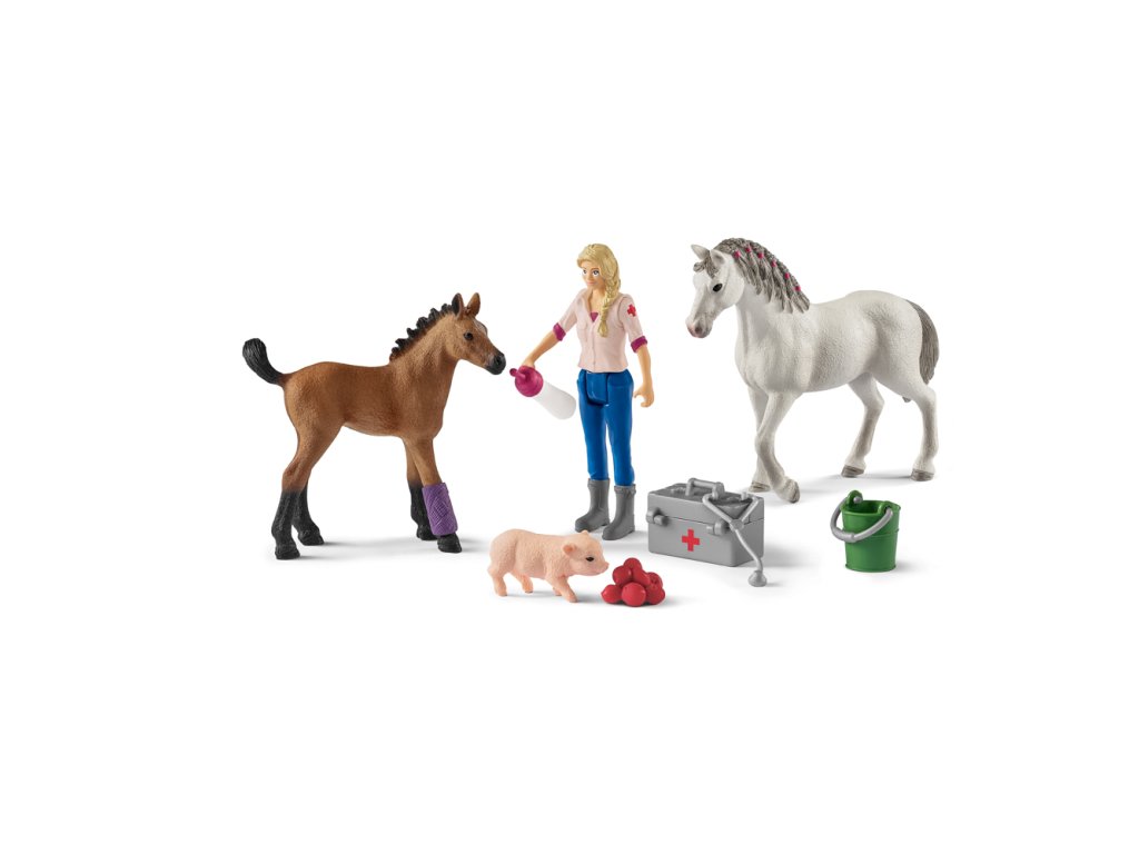 Báječná sada doplňků k nové koňské stáji se 3 roztomilými zvířátky (klisna, hříbě, sele), veterinářkou a spoustou doplňků. Veterinářka ošetřuje hříbě a mění mu obvaz a klisna ji přitom sleduje a dává pozor, aby se hříbátku nic nestalo. Veterinářka se se svým lékařským kufříkem vydává do stáje, aby ošetřila hříbě amerického honáckého koně. Když ošetřuje hříbě, mění mu obvaz a poslouchá ho stetoskopem, klisna amerického honáckého koně se zájmem přihlíží. Dává přitom velice dobrý pozor, aby se hříbátku nic nestalo. Drzé prasátko z farmy je taky všude a využije každou příležitost slupnout pár šťavnatých jablek, když se zrovna nikdo nedívá. Po ošetření dostane hříbátko za odměnu napít mléka z lahvičky. Báječná sada doplňků k nové koňské stáji se 3 roztomilými zvířátky, veterinářkou a spoustou doplňků. Zvěrolékařka s pohyblivýma rukama a nohama! Lékařský kufřík můžete otevírat a zavírat! Obsahuje: 1× klisna amerického honáckého koně, 1× hříbě amerického honáckého koně, 1× sele, 1× veterinářka, 1× obvaz, 1× lahvička, 1× lékařský kufřík, 1× stetoskop, 1× kyblík. Rozměr balení: 19 x 11,5 x 5,5 cm. Nevhodné pro děti do 3 let. Doporučený věk: 3-8
