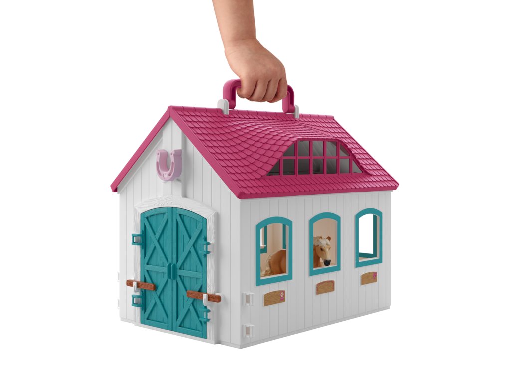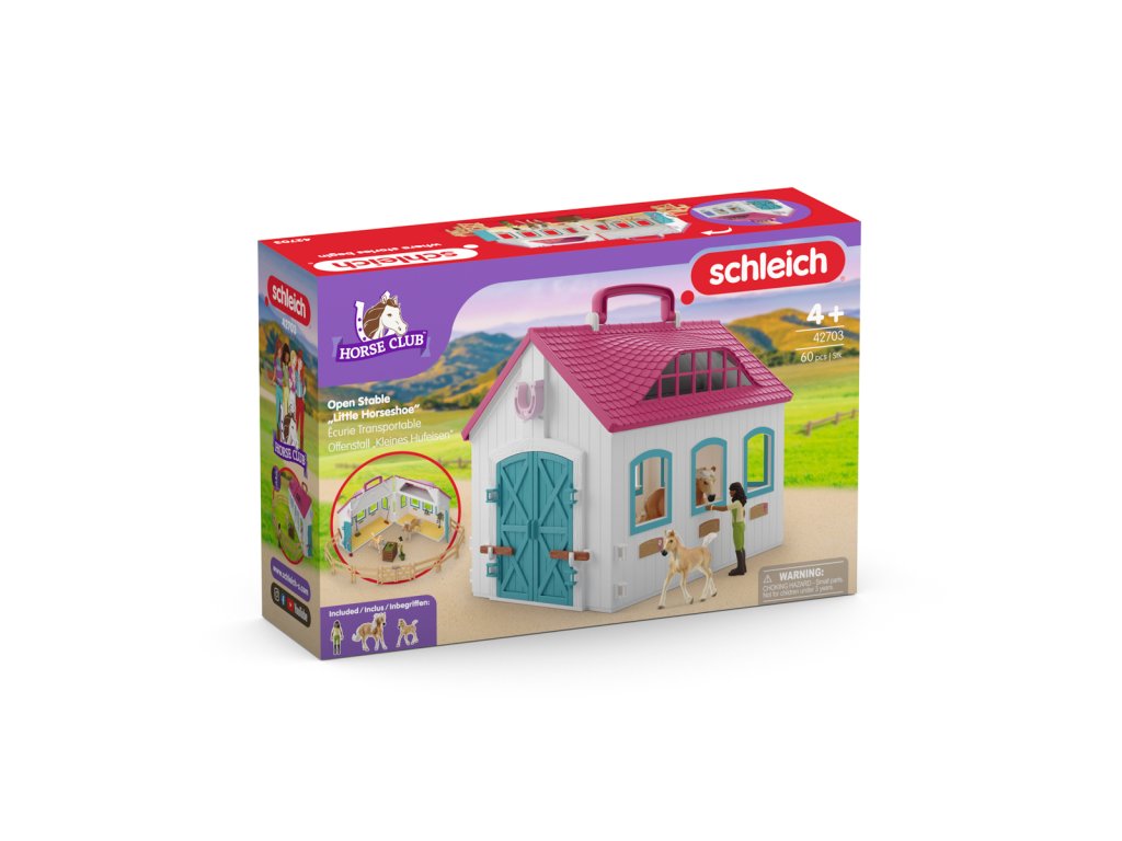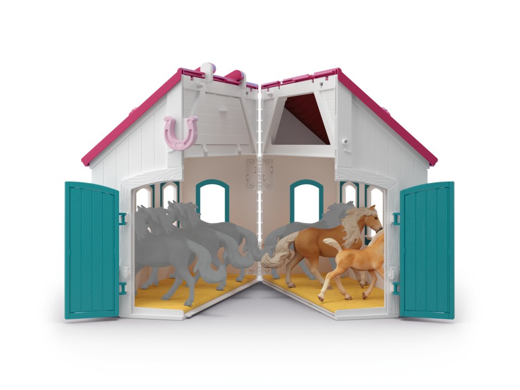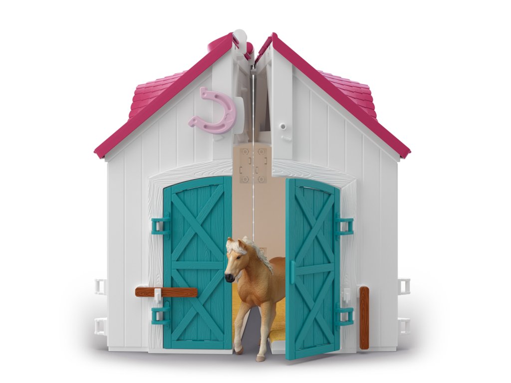 Lakeside má nový přírůstek! V nové otevřené stáji se koně můžou volně pohybovat a jsou na čerstvém vzduchu! Sarah krmí haflingerskou klisnu a její hříbě. Sarah si užívá čas strávený v otevřené stáji u jezera „Little Horseshoe“. Koně jsou tu obzvlášť spokojení, protože jsou hodně venku. Když Sarah otevře bránu do výběhu, přátelská haflingerská klisna si to zamíří rovnou k ní. Sarah jí dá mrkev a pak jí nasadí sedlo. Ráda by se dnes projela, ale hříbě je ještě příliš malé. Později jí Sarah nasadí vodicí lano a postupně ji na něj zvykne. Jen se ujisti, že je brána zamčená! Jinak by se hříbě mohlo vylekat a utéct. Otevřená stáj u jezera „Little Horseshoe“ se dá složit do kufru a vzít kamkoli s sebou. Veškeré příslušenství, jako jsou balíky sena, svazek mrkve nebo hřeben, je možné bezpečně uložit do přídavného prostoru pod střechou. Tady jsou taky umístěny prvky oplocení výběhu. Cestou se tak nic neztratí. Místo pro 6 koní v zavřeném stavu. Pouzdro se dá zcela otevřít až na 180 stupňů. Figurka Sarah je plně pohyblivá. Tento výrobek Schleich® patří do tematického světa HORSE CLUB a je vhodný pro děti ve věku od 5 do 12 let. Obsahuje: 1× otevřená budova stáje, 1× haflingerská klisna, 1× haflingerské hříbě, 1× uzda s otěžemi, 1× sedlo, 1× růžová stájová ohlávka, 1× růžové vodicí lano, 1× sedlová deka, 1× figurka Sarah, 1× helma, 1× páska na ruku, 2× vložka do seníku, 2× rám brány, 2× výplň brány, 2× zámek na dveře, 10× prvek do výběhu, 1× zámek brány do výběhu, 1× upevňovač podkov, 1× krmný žlab, 1× vidle, 1× kbelík, 1× koště, 2× balík sena, 1× vidle na seno, 1× hřeben, 1× žlab na vodu, 1× svazek mrkve, 2× střešní okno, 1× arch se samolepkami, 1× návod k sestavení. Rozměry složeného produktu: 29,5 x 20 x 30 cm. Rozměry balení: 32 x 48 x 14 cm.