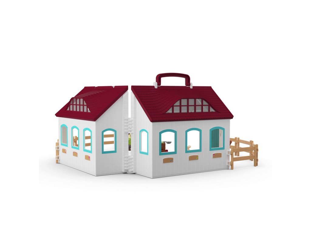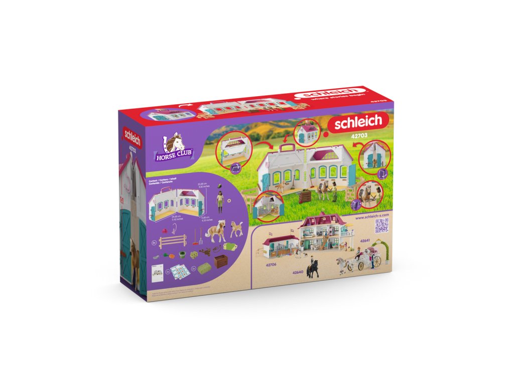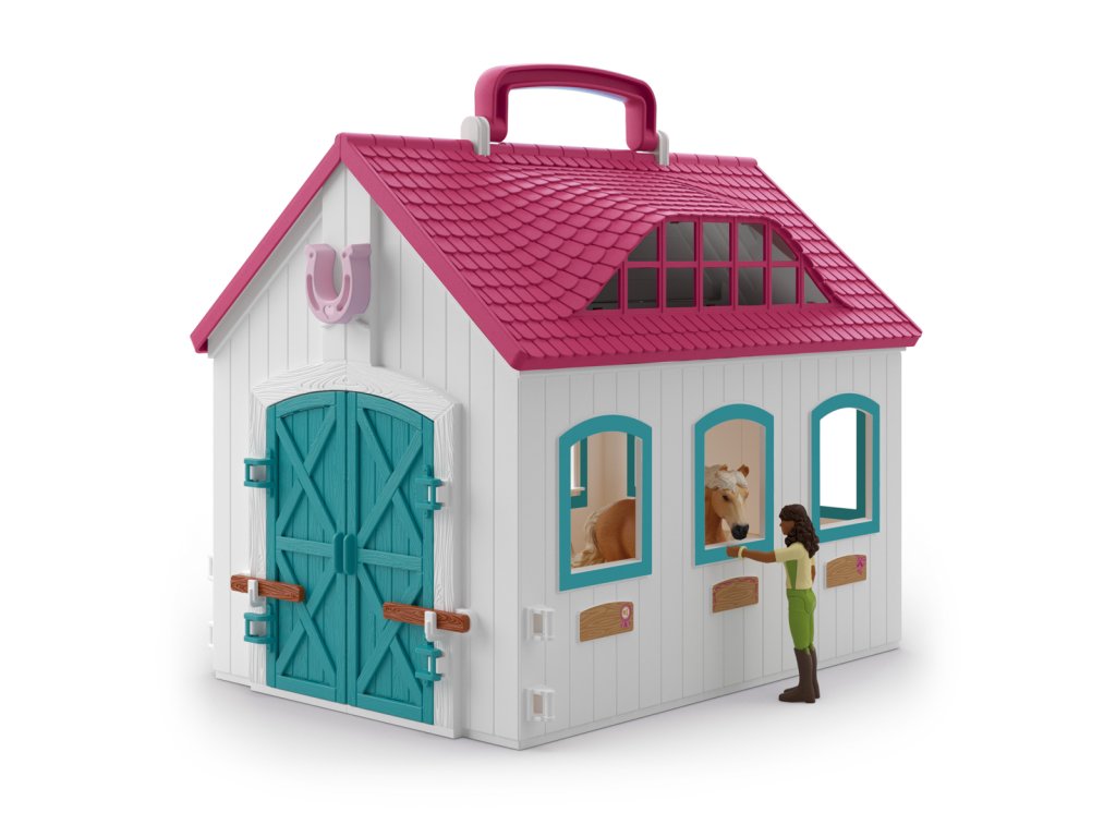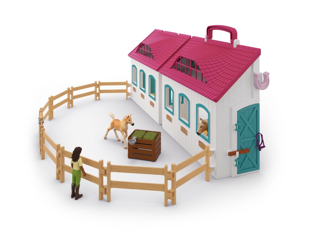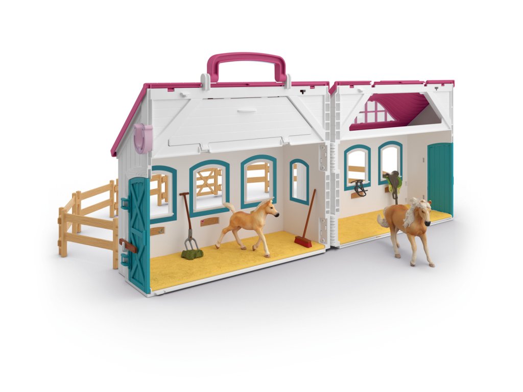 Lakeside má nový přírůstek! V nové otevřené stáji se koně můžou volně pohybovat a jsou na čerstvém vzduchu! Sarah krmí haflingerskou klisnu a její hříbě. Sarah si užívá čas strávený v otevřené stáji u jezera „Little Horseshoe“. Koně jsou tu obzvlášť spokojení, protože jsou hodně venku. Když Sarah otevře bránu do výběhu, přátelská haflingerská klisna si to zamíří rovnou k ní. Sarah jí dá mrkev a pak jí nasadí sedlo. Ráda by se dnes projela, ale hříbě je ještě příliš malé. Později jí Sarah nasadí vodicí lano a postupně ji na něj zvykne. Jen se ujisti, že je brána zamčená! Jinak by se hříbě mohlo vylekat a utéct. Otevřená stáj u jezera „Little Horseshoe“ se dá složit do kufru a vzít kamkoli s sebou. Veškeré příslušenství, jako jsou balíky sena, svazek mrkve nebo hřeben, je možné bezpečně uložit do přídavného prostoru pod střechou. Tady jsou taky umístěny prvky oplocení výběhu. Cestou se tak nic neztratí. Místo pro 6 koní v zavřeném stavu. Pouzdro se dá zcela otevřít až na 180 stupňů. Figurka Sarah je plně pohyblivá. Tento výrobek Schleich® patří do tematického světa HORSE CLUB a je vhodný pro děti ve věku od 5 do 12 let. Obsahuje: 1× otevřená budova stáje, 1× haflingerská klisna, 1× haflingerské hříbě, 1× uzda s otěžemi, 1× sedlo, 1× růžová stájová ohlávka, 1× růžové vodicí lano, 1× sedlová deka, 1× figurka Sarah, 1× helma, 1× páska na ruku, 2× vložka do seníku, 2× rám brány, 2× výplň brány, 2× zámek na dveře, 10× prvek do výběhu, 1× zámek brány do výběhu, 1× upevňovač podkov, 1× krmný žlab, 1× vidle, 1× kbelík, 1× koště, 2× balík sena, 1× vidle na seno, 1× hřeben, 1× žlab na vodu, 1× svazek mrkve, 2× střešní okno, 1× arch se samolepkami, 1× návod k sestavení. Rozměry složeného produktu: 29,5 x 20 x 30 cm. Rozměry balení: 32 x 48 x 14 cm.