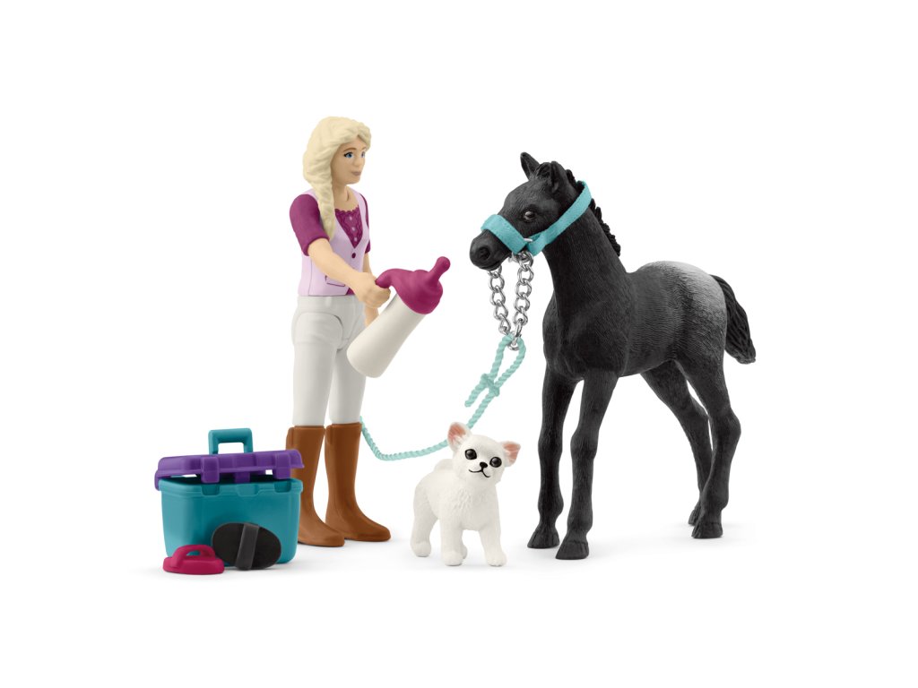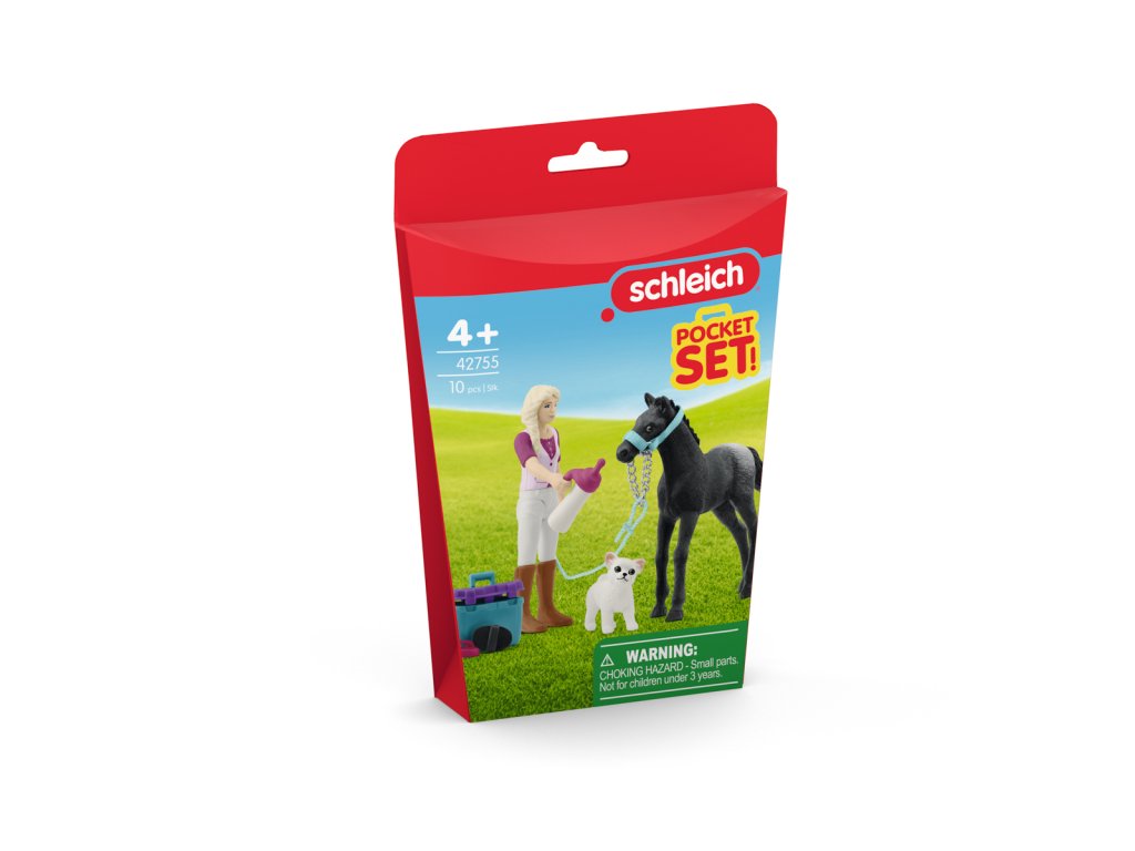 Sofie se o malé hříbě láskyplně stará a něžně ho krmí z láhve. Chceš taky zažít kouzlo péče a spřátelit se s hříbátkem i roztomilým štěňátkem čivavy? Sada pro péči o hříbě je už připravená. Aby se malé hříbě plemene Appaloosa při úpravě nehýbalo, nasadí mu Sofie nejdřív ohlávku. Pak může začít. Vezme z boxu hřeben a kartáč a důkladně hříběti vykartáčuje jeho krásnou černou srst. Sněhobílé štěně čivavy tomu s údivem přihlíží. Hříbě má docela rádo publikum. Ale ze všeho nejvíc se těší na láhev, kterou dostane za odměnu. Stájová ohlávka je snímatelná. Figurka Sofie je plně pohyblivá. Obsah: 1× figurka Sofie, 1× hříbě plemene Appaloosa, 1× štěně čivavy, 1× láhev na krmení, 1× box na hřebelcování, 1× hřeben, 1× kartáč na hřebelcování, 1× ohlávka. Hrací sada mini figurek se dá použít samostatně nebo v kombinaci se stávajícími výrobky HORSE CLUB. Tahle hrací sada je součástí sady POCKET SET a je vhodná pro děti od 4 let. Rozměry balení: 19,9 x 10 x 5,8 cm.