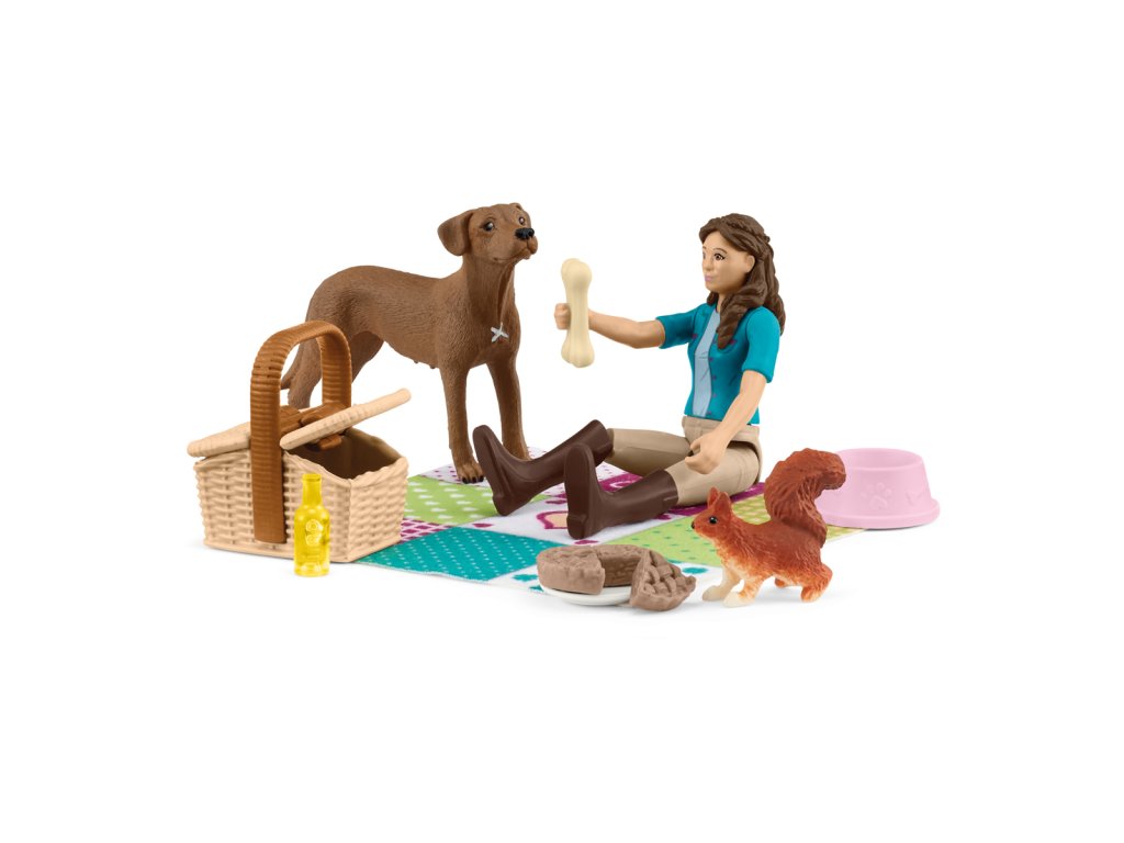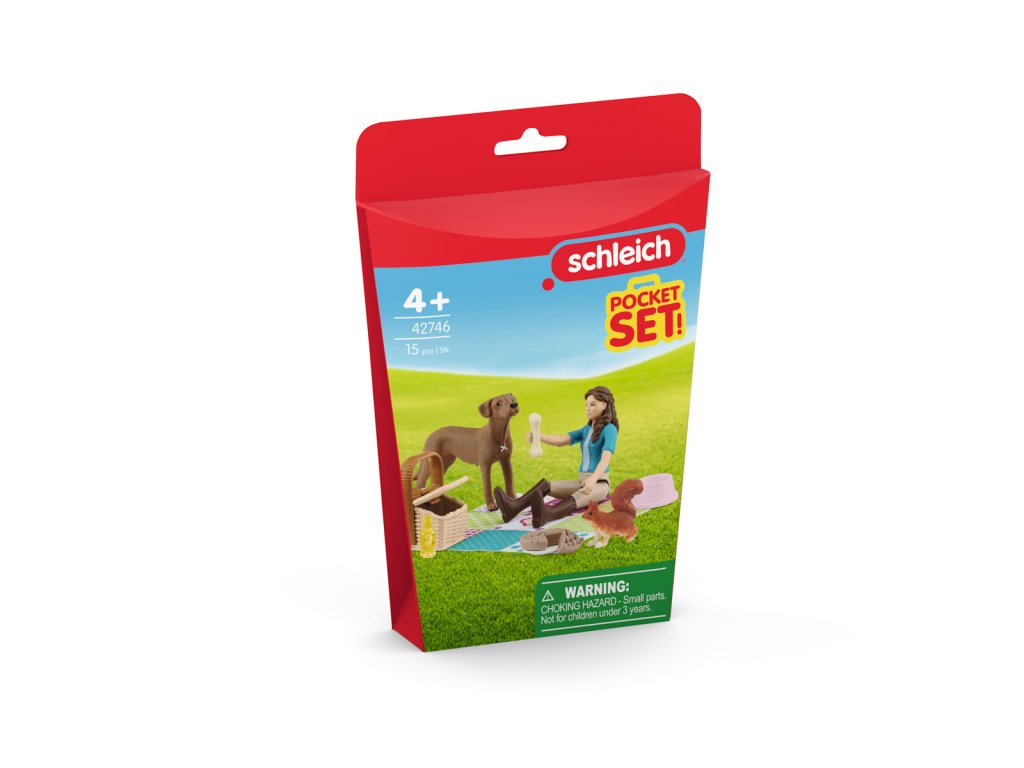 Den v přírodě je prostě nejlepší. Rhodéský ridgeback se chystá na piknik s Lisou v lesích Peppertree. Krásně to tu voní a ridgeback to chce prozkoumat. Když ho ovšem Lisa přiláká zpátky psí kostí, velký hnědý rhodéský ridgeback okamžitě přiběhne. Nestává se to každý den, že by se mu dostalo takového potěšení. Počkej, co to je? Veverka si chce ukrást kousek šťavnatého jablečného koláče! V žádném případě! Stačí jedno hlasité „haf!“ a zvířátko zmizí zpátky v lese. Lisa se musí smát. Napije se ze své láhve a nalije vodu do psí misky. Úžasné! Figurka Lisy je plně pohyblivá. Obsah: 1× figurka Lisy, 1× rhodéský ridgeback, 1× veverka, 1× pikniková deka, 1× piknikový koš, 4× kousky jablečného koláče, 1× láhev, 1× talíř, 1× psí miska, 1× kost. Hrací sada mini figurek se dá použít samostatně nebo v kombinaci se stávajícími výrobky HORSE CLUB. Tahle hrací sada je součástí sady POCKET SET a je vhodná pro děti od 4 let. Rozměry balení: 19,9 x 10 x 5,8 cm.