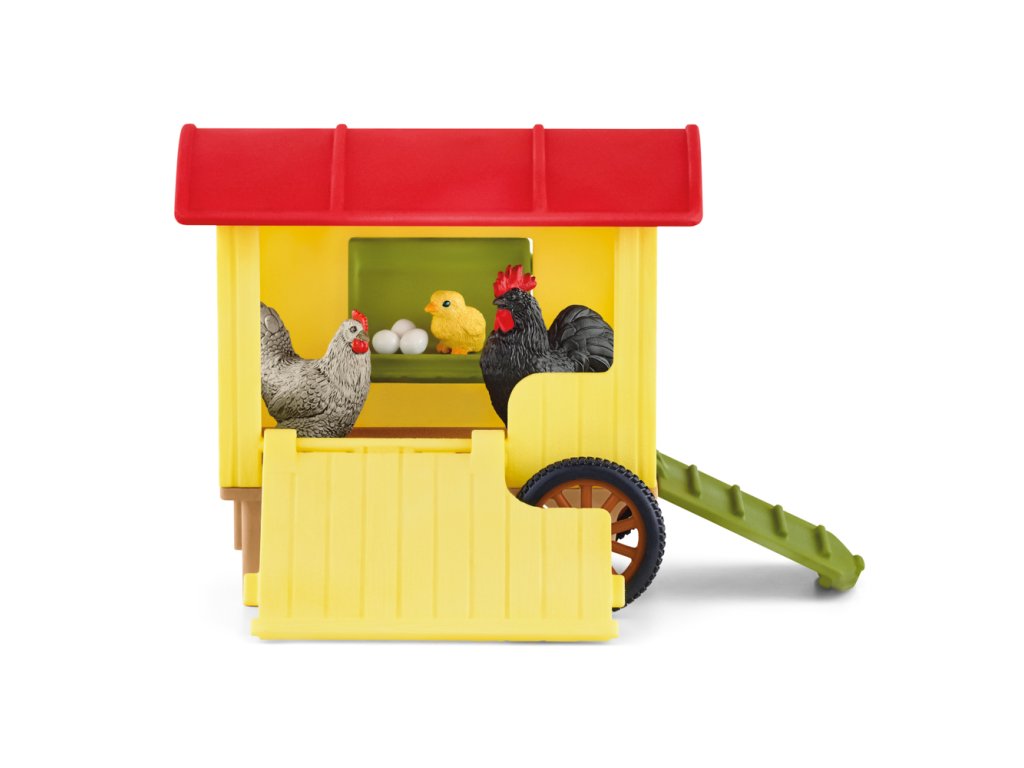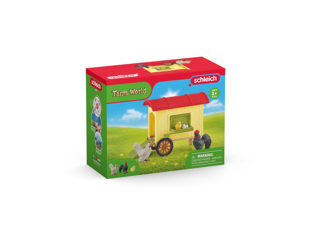 Kykyryký! Náš kohout je vzhůru. Po klidné noci strávené v kurníku z kolekce Schleich® FARM WORLD kohout rád vyskočí na střechu, aby všem oznámil, že je čas vstávat. Matka slepice už nepotřebuje ani budík a může si jít hledat zrní a další potravu do oploceného venkovního prostoru. Koneckonců, kdo dřív přijde, ten dřív mele! A když kohout sestupuje ze střechy, aby spolu se slepicí hledal potravu, můžeš otevřít střechu a podívat se dovnitř. A podívej: několik vajec už se vylíhlo a nejroztomilejší mláďátka na celém světě začínají zkoumat a dělat první krůčky. Pomůžeš jim? Sada obsahuje: 1× pojízdný kurník s bočními výklopnými dvířky, rampou a líhní, 1× kohout, 1× slepice, 1× kuře, 1× vejce. Rozměry: 15 x 19 x 8,2 cm Věk: 3+