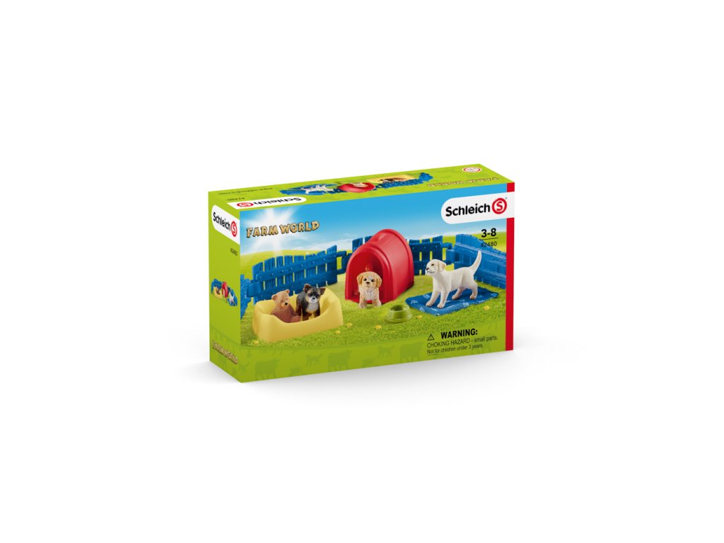 V pokoji pro štěňata si spolu hrají maltipoo, čivava a labradorský retrívr. Co jsou ti tři schopni spolu natropit za rozpustilý nepořádek! Hrají si na měkké dece, přetahují se o plyšového medvěda a hrají si na schovávanou. Občas si zaslouženě schrupnou v psím pelíšku. Zábavný fakt: Malý plůtek brání těm třem zvědavým štěňatům v útěku. Funkce: Libovolně připojitelné části plotu! Díly plotu lze zkombinovat se všemi ploty Schleich®. Obsah: 1× štěně maltipoo, 1× štěně čivavy, 1× štěně labradorského retrívra, 1× psí bouda, 1× psí pelíšek, 1× deka, 1× miska, 1× plyšový medvídek, 5× plot. Rozměr balení: 19 x 11,5 x 5,5 cm. Figurky Schleich jsou mimořádně detailní, láskyplně malované a umožňují dětem hrát si a zároveň se učit. Nevhodné pro děti do 3 let. Doporučený věk: 3-8