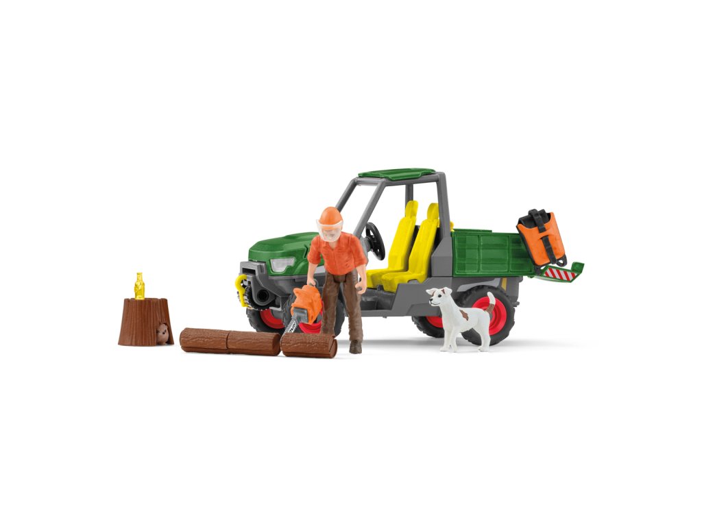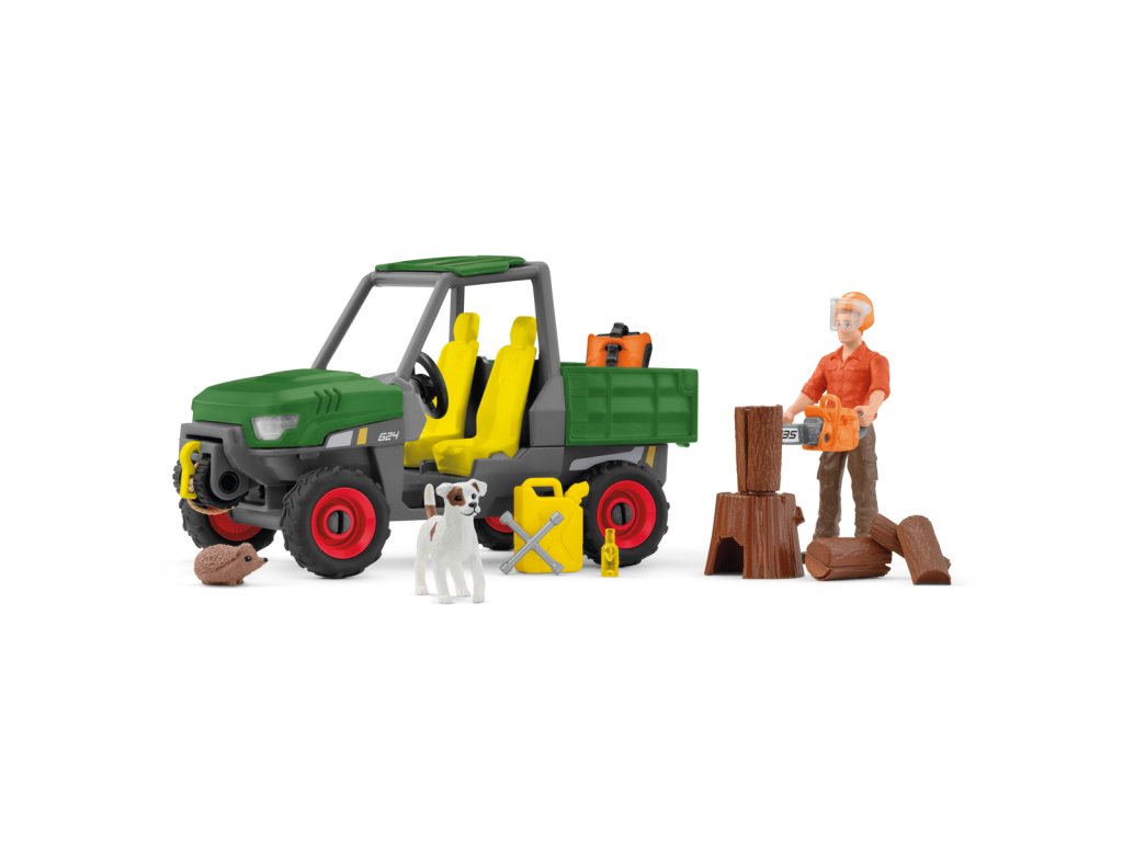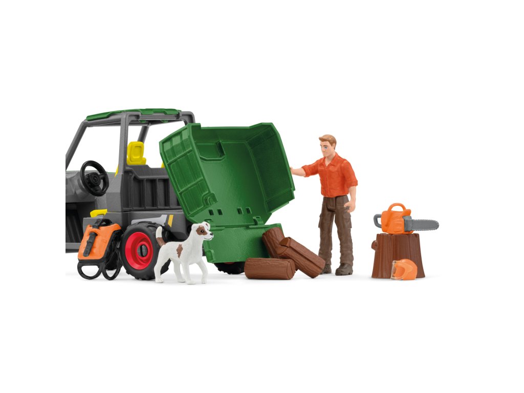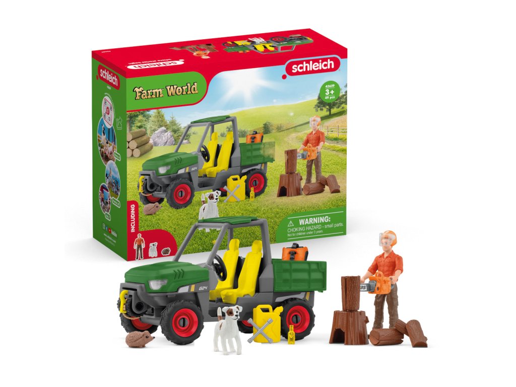 Farmář Paul musí v lese naštípat dříví, než přijde zima. Proto jezdí se svým autem s pohonem všech kol do lesa k pokáceným stromům. Pomocí navijáku vytáhne z hromady těžký kmen stromu. Nasadí si ochrannou přilbu a pomocí motorové pily kmen rozřeže. Jeho Jack Russell teriér ho pozoruje, aby neudělal něco špatně. Když je konečně hotový, žíznivě se napije studené limonády. Hej, kdo to vykukuje z křoví? Ježek přišel od krmelce (prodává se samostatně) a pozoruje ho! Balení: 27,7x22,3x10,7cm. Věk: 3+
