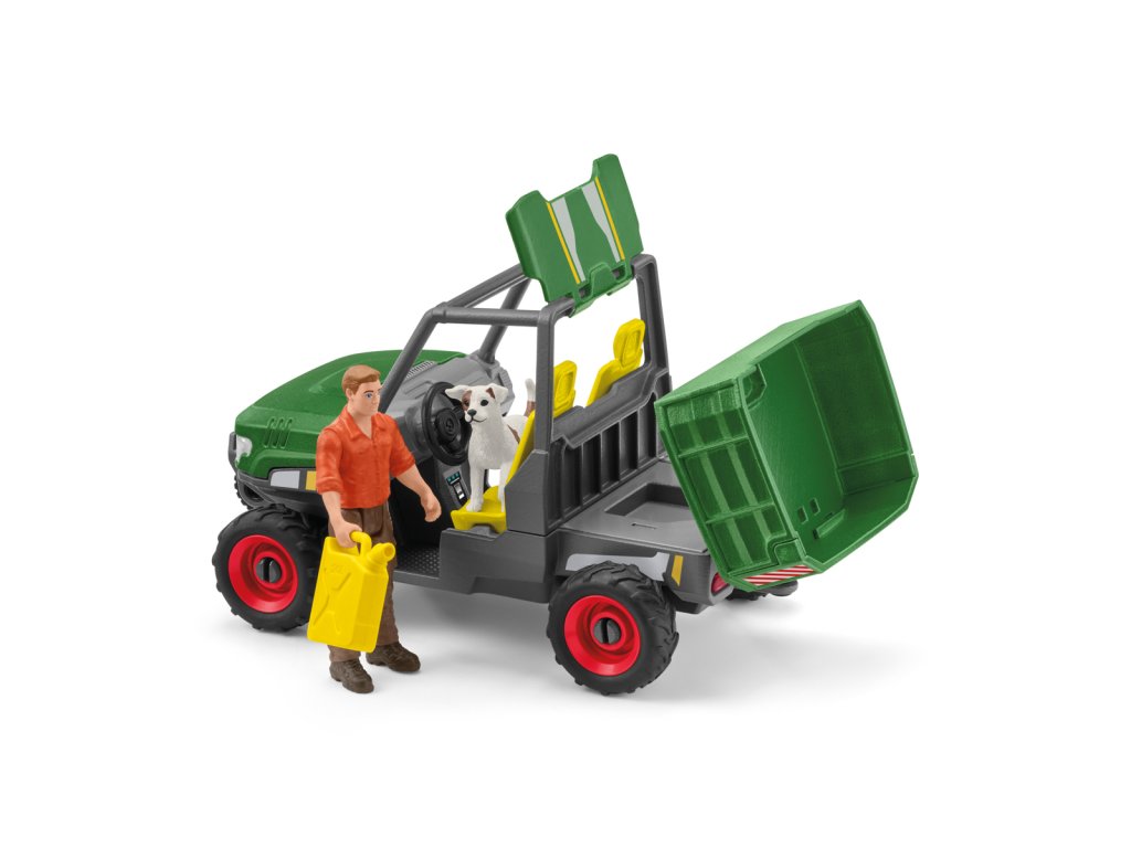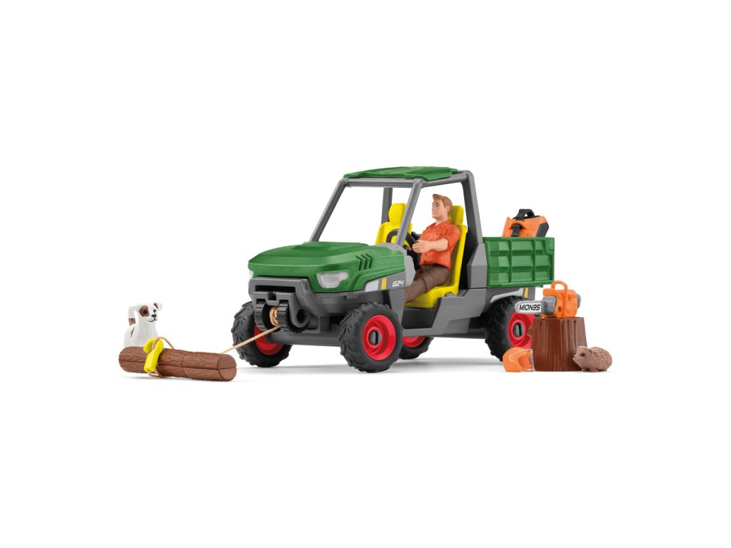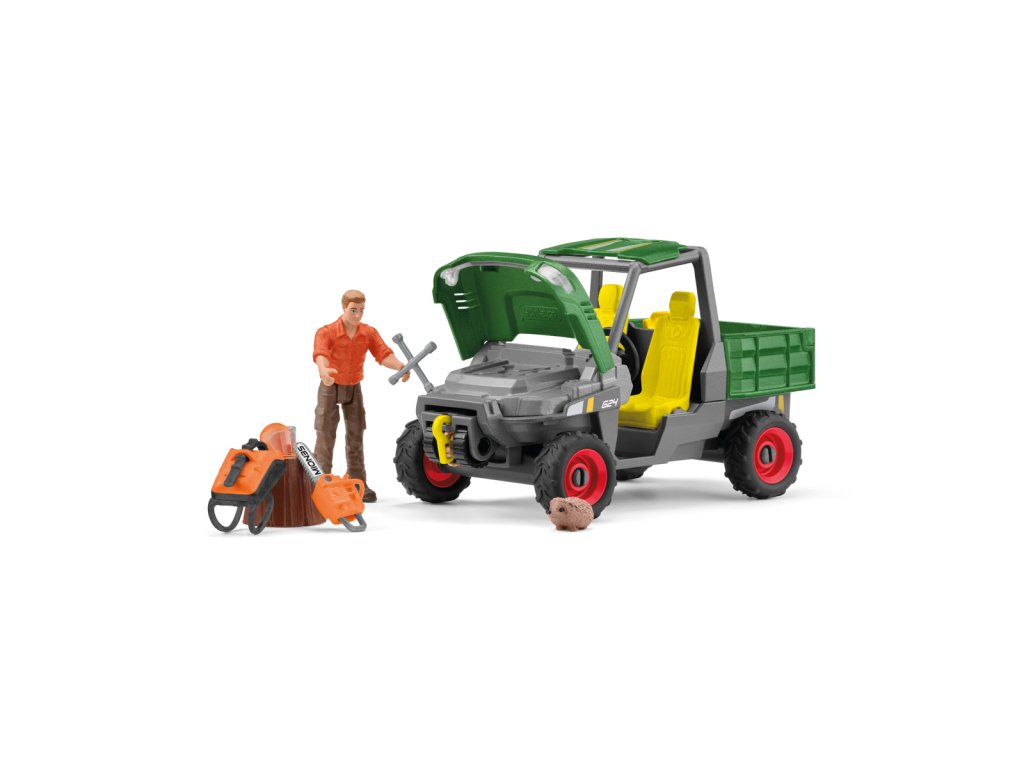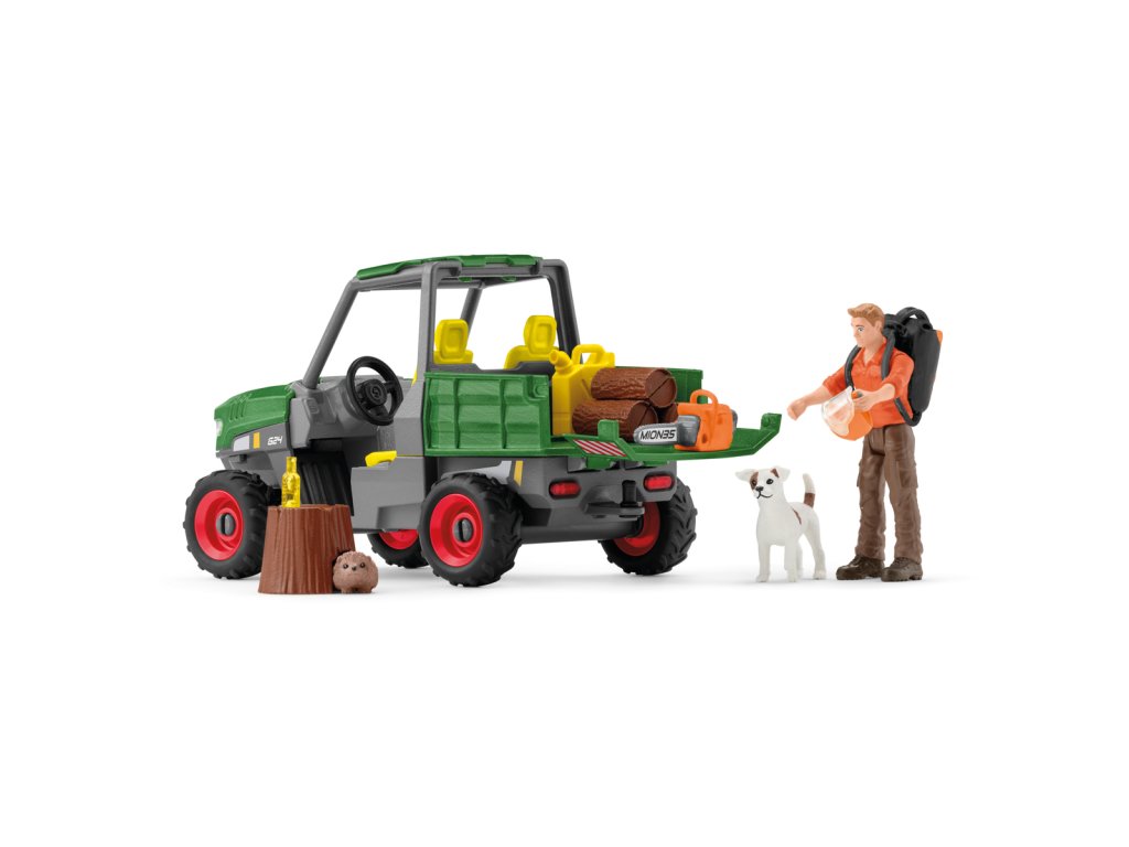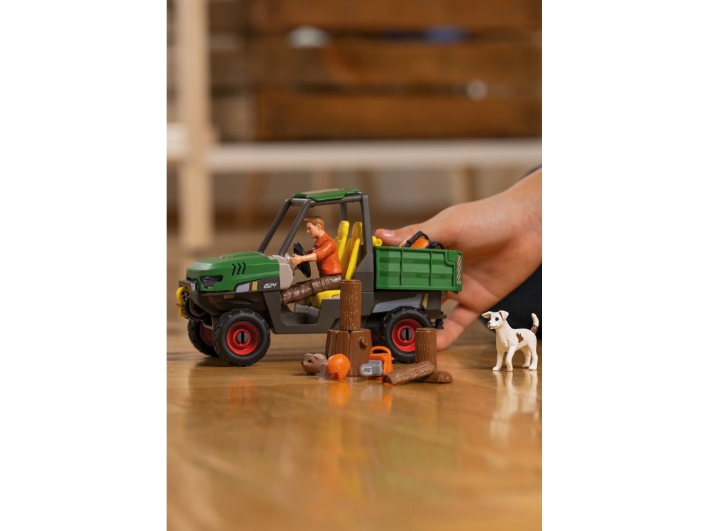 Farmář Paul musí v lese naštípat dříví, než přijde zima. Proto jezdí se svým autem s pohonem všech kol do lesa k pokáceným stromům. Pomocí navijáku vytáhne z hromady těžký kmen stromu. Nasadí si ochrannou přilbu a pomocí motorové pily kmen rozřeže. Jeho Jack Russell teriér ho pozoruje, aby neudělal něco špatně. Když je konečně hotový, žíznivě se napije studené limonády. Hej, kdo to vykukuje z křoví? Ježek přišel od krmelce (prodává se samostatně) a pozoruje ho! Balení: 27,7x22,3x10,7cm. Věk: 3+