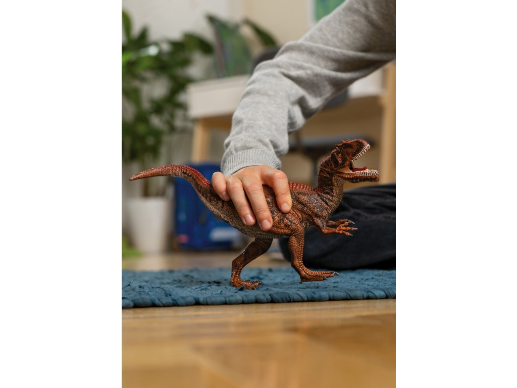 Kdo to přichází zpoza rohu? Díky těžkým krokům už z dálky poznáte, že je to Allosaurus. Vysoký obr kráčí po dvou nohách džunglí a hledá kořist. Přestože je tak velký, je docela dobře maskovaný. Jeho ještěří kůže je totiž vzorovaná tak, že dokonale splývá s okolím. Okolí si prohlíží korálkovýma žlutýma očima. Doufejme, že se najednou nerozhodne, že chce svačinu! Není divu, že tenhle obávaný masožravec patří k nejnebezpečnějším dravcům ve světě dinosaurů.