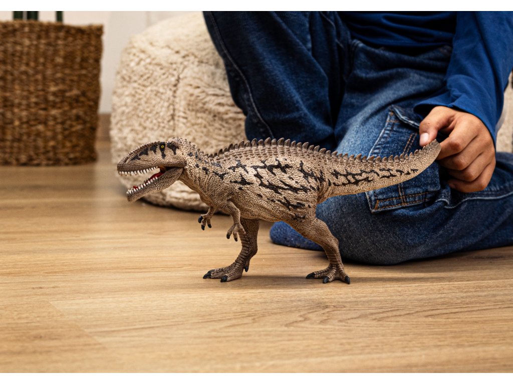 Carcharodontosaurus je taky známý jako ostrozubý ještěr, což tohohle nádherného dinosaura skvěle vystihuje. V pohyblivé čelisti má dvě řady mimořádně ostrých tesáků. Jako masožravec je potřebuje taky k porcování kořisti. Když má hlad, vytrvale se žene za svou večeří, dokud ji nesežere. Díky dlouhým zadním nohám je při lovu poměrně rychlý. S carcharodontosaurem se raději potkej až ve chvíli, kdy už bude po večeři! Carcharodontosaurus má obzvlášť nápadnou ještěří kůži. Je kamenně šedý s hnědými hvězdicovitými skvrnami. Na hřbetě se mu tyčí špičatý hřeben, který sahá až k dlouhému čenichu. Nejvýraznějším znakem jsou ovšem jeho ostré tesáky zasazené do obrovských, pružných čelistí. Raději se nepřibližuj! Carcharodontosaurus má pohyblivou čelist. Tento výrobek Schleich® patří do tematického světa DINOSAURS a je vhodný pro děti ve věku od 4 do 10 let. Rozměry figurky: 13 x 8 x 33 cm.