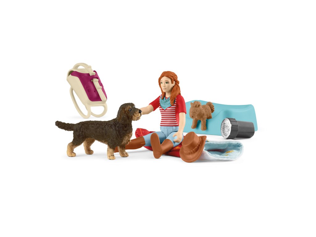 Hrubosrstý jezevčík se těší, až stráví noc blízko Hannah. Oba dnes chtějí spát ve stáji. Dívka se už pohodlně uvelebila na seně, sundala si kovbojský klobouk a rozbalila si spacák. Pro svého čtyřnohého přítele dokonce přinesla košík pro psy. A co by to bylo za přespávačku, kdyby tu nebyl i plyšový koník. Už je tma. Co je to za praskavý zvuk? Hrubosrstý jezevčík zavrčí. Hannah je hned vzhůru. Rychle vytáhne z batohu baterku a posvítí si na stáj. Nic tam není. Asi to bylo jen vrzání trámů způsobené větrem. To je ale dobrodružství! Figurka Hannah je plně pohyblivá. Obsah: 1× figurka Hannah, 1× klobouk, 1× drsnosrstý jezevčík, 1× plyšový kůň, 1× spací pytel, 1× batoh, 1× proutěný pelíšek pro psa, 1× baterka. Hrací sada mini figurek se dá použít samostatně nebo v kombinaci se stávajícími výrobky HORSE CLUB. Tahle hrací sada je součástí sady POCKET SET a je vhodná pro děti od 4 let. Rozměry balení: 19,9 x 10 x 5,8 cm.